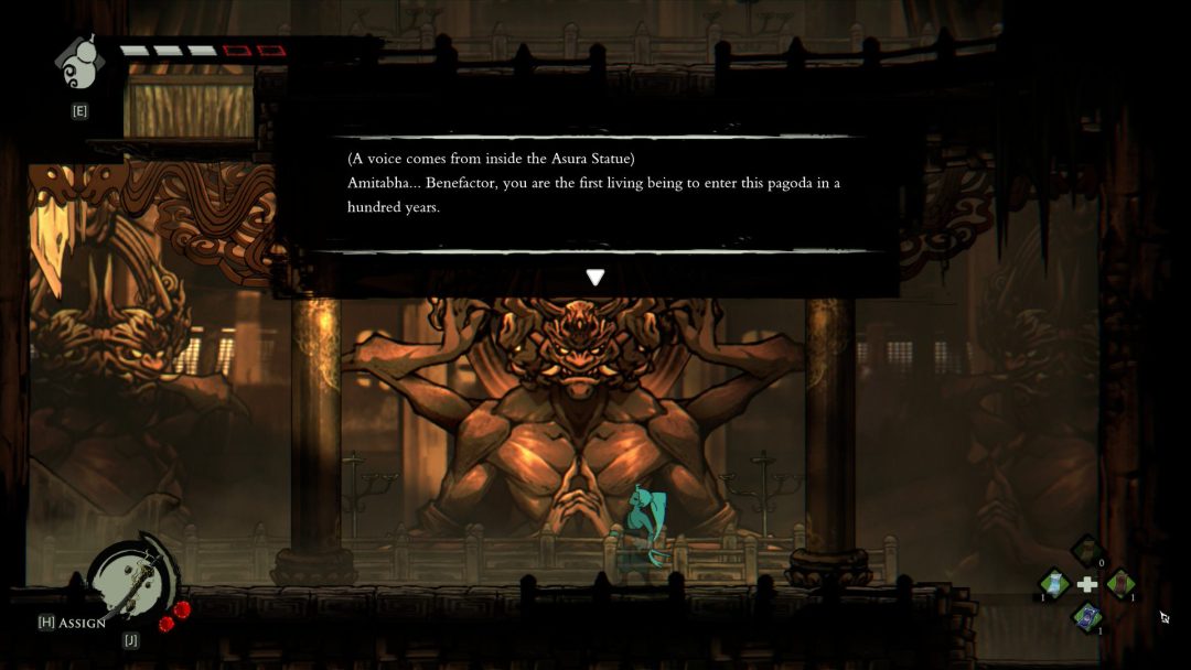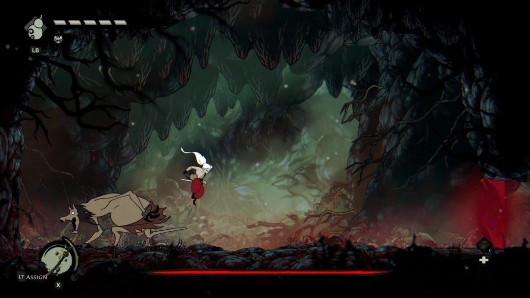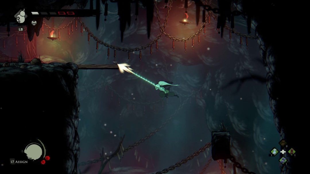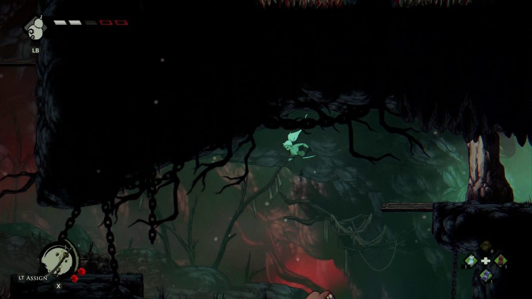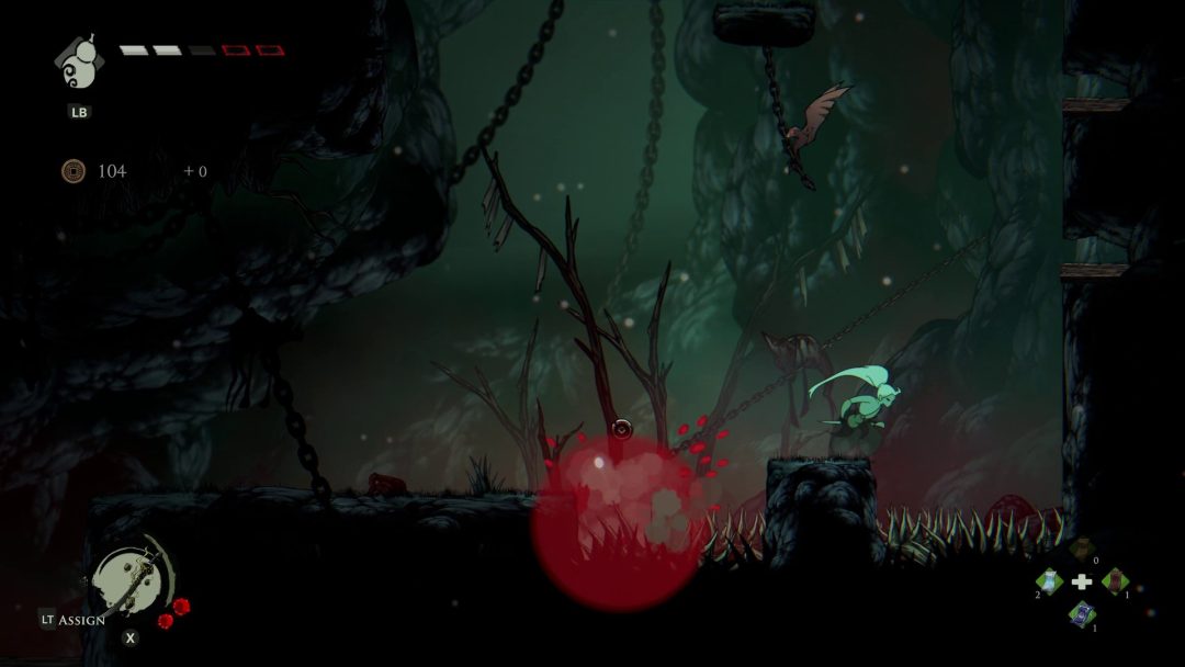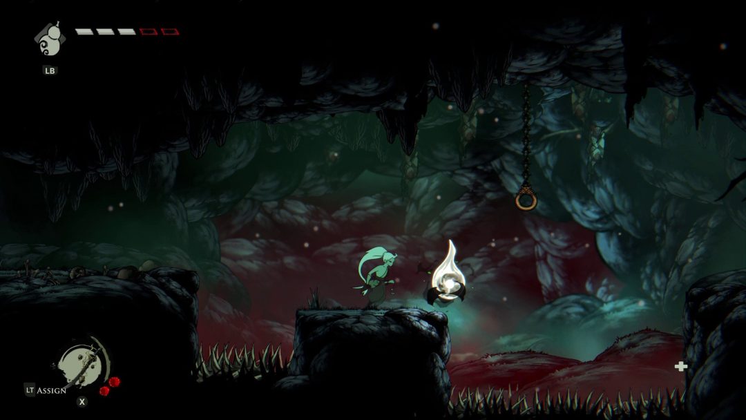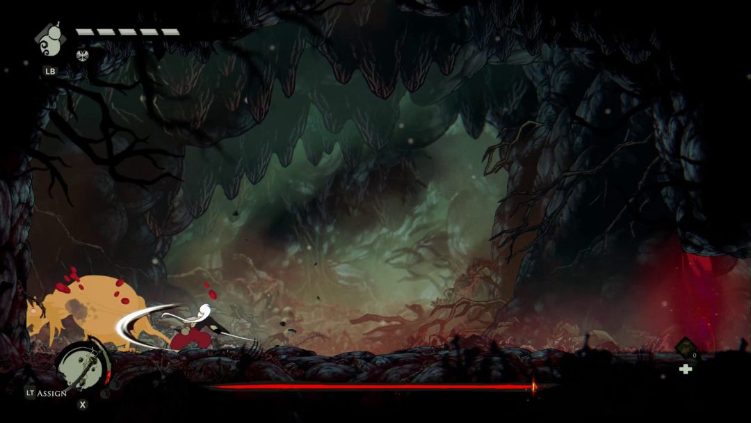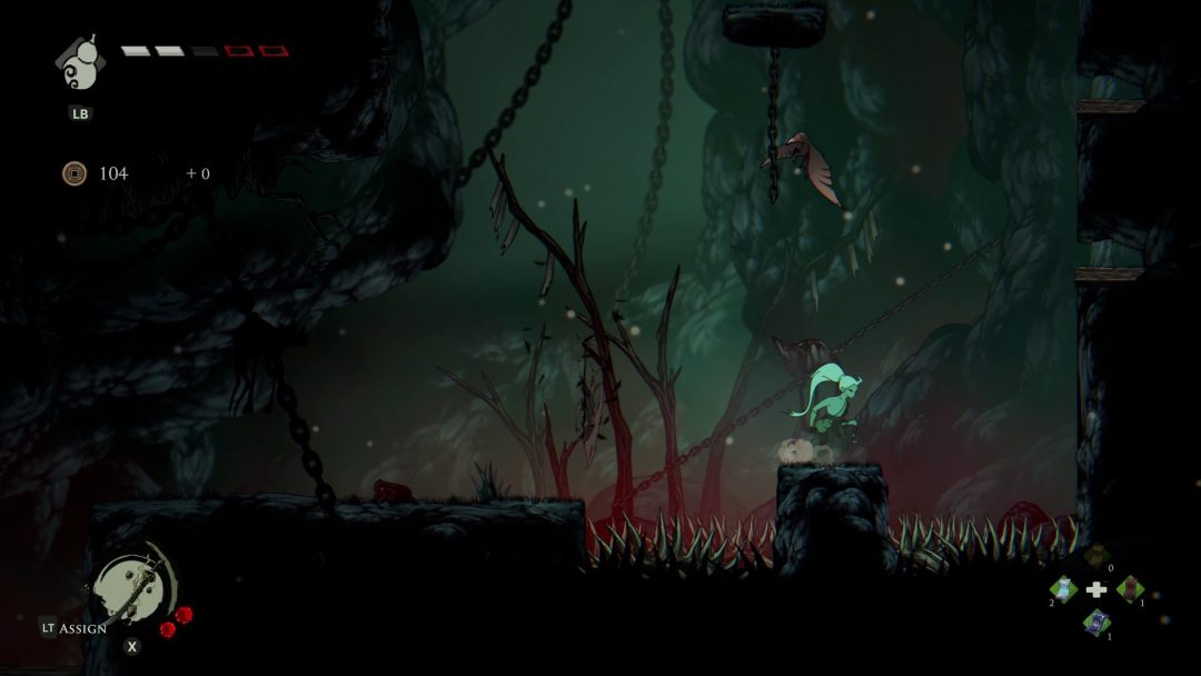 また本作はいわゆる「死にゲー」のような仕組みもあり、『Demon’s Souls(デモンズソウル)』における、プレイヤーキャラクターが死亡した後の状態を指す「ソウル体」のような仕組みが取り入れられている。ソウル体では体力が半減するが、死に戻りを繰り返して冒険を継続していくことになるわけだ。死んだ場所に戻って自身の魂のようなものを取り戻すことで生身にもどることができるが、メトロイドヴァニアの広大なマップではほぼ諦めるしかない場合も存在する。別の方法として休憩所でお金を払うことでソウル体から生身に戻ることができるものの、その際は結構な金額が要求される。そのため、ソウル体から生身に戻る場合はボス戦などのここぞという勝負どころになるときぐらいかもしれない。死を繰り返して挑戦を続ける様子は、主人公が作中において特別な存在である設定にもマッチしている。