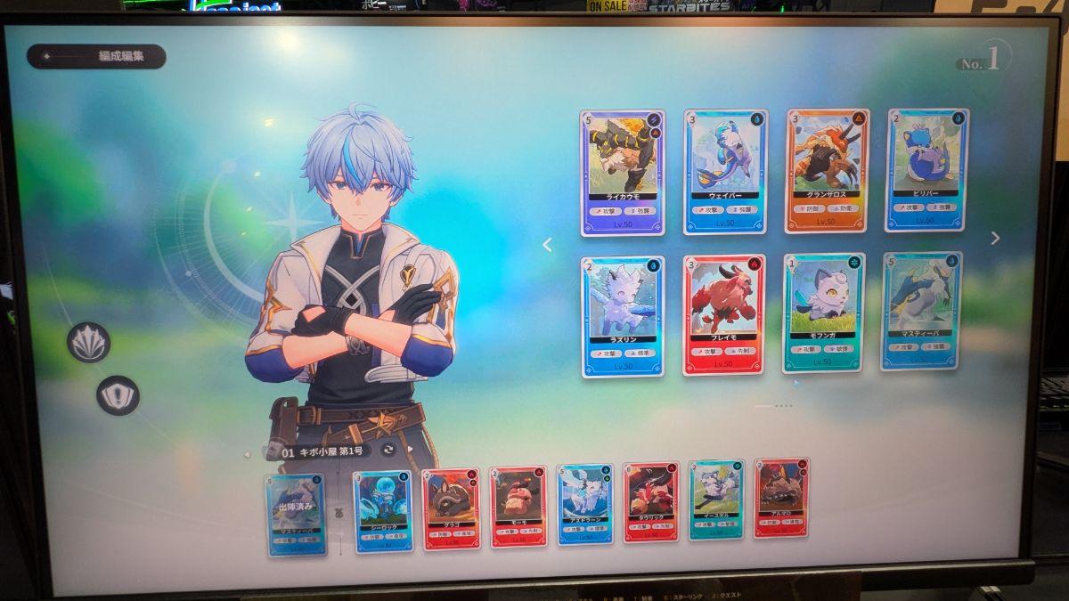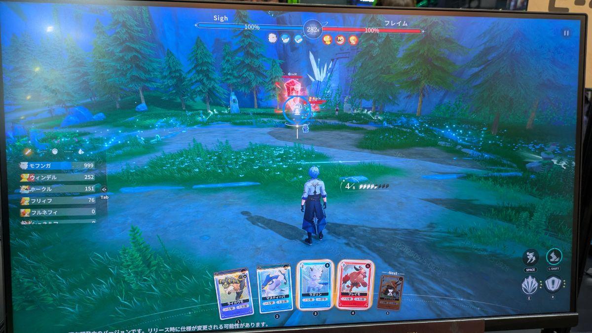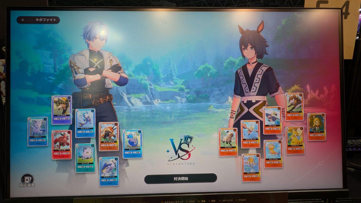 これまで紹介してきたキボ収集や爽快アクションはハイクオリティに仕上がりつつも、ある種現代のRPG作品としてはオーソドックスな印象を受けた。ただ、キボ同士を戦わせる「キボファイト」は本作ならではだと感じられた。キボファイトは試遊内ではエリアクエストとして受注する形だったが、こちらはバトル前に合計8枚のカードデッキを組んで戦うリアルタイムストラテジー風味のミニゲームだ。時間経過で溜まるコストを消費し、手札に回ってきた自分のキボを選んで召喚していく。