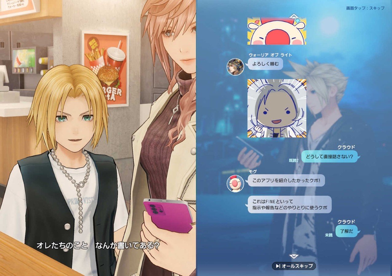 さらに本作では、「FINE」という『FF』キャラクター同士によるチャットも収録されている。歴代の『FF』戦士たちの日常を描いたショートエピソードを、グループチャット形式で見ることができるのだ。彼らの会話シーンの中に、「既読2」などと表示されている様子はなんだかシュールで面白い。現代の日本を舞台にしているからこそできる、ユーモラスな演出だといえるだろう。このように、キャラクターたちの新たな一面を垣間見られるコンテンツも用意されている。