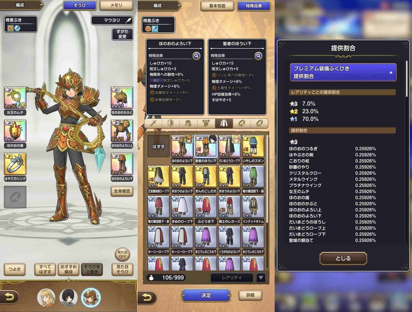 続いて、ドラクエおなじみの装備品だ。本作では武器と4部位の防具、2つのアクセサリを装備可能。装備品には属性などが設定されており、アクセサリを除く装備品はガチャで獲得して強化していく。装備品のレア度は3段階となっており、最高レア星3の提供割合は7%と比較的高く設定されているのは嬉しいところだ。とはいえ、武器と防具すべてが混ざったガチャとなっているため、狙った部位の装備品を獲得するのは大変そうである。5凸まで可能となっているので、装備部位ごとのガチャも別途用意されればありがたい。ちなみに見た目だけに反映される見た目装備機能のほか、仲間のキャラクリも制限なく自由におこなえるため、着せ替えを存分に楽しめるのは嬉しい仕様だ。