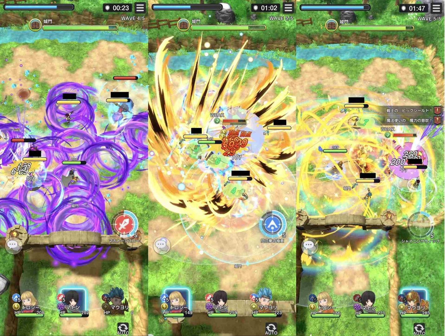 さらに、本作のバトルシステムの最大の特徴が必殺技である「スマッシュ」だ。通常攻撃を当てるとゲージが溜まり、スマッシュアイコンをタップすると必殺技が発動。必殺技は強力かつ広範囲であるのはもちろん、スマッシュで敵を倒せば通常よりも大量のグロウ結晶を入手できる。また、スマッシュで倒した敵は壁に何度もぶつかるほど転がり、時には画面手前まで3次元的にド派手に吹き飛んでいくので超爽快。ゲージはすぐに溜まるので、スライムのような弱い魔物の大群に対してもスマッシュを使うことで効率よくグロウできるうえに何度も爽快感を味わえるのだ。必殺技を温存するのではなく撃ちまくることが推奨される珍しいシステムとなっていた。とはいえ、通常攻撃で削ったうえで倒せるタイミングで発動したり、大量の敵を巻き込めるような位置取りをしたりといった戦略は求められる。