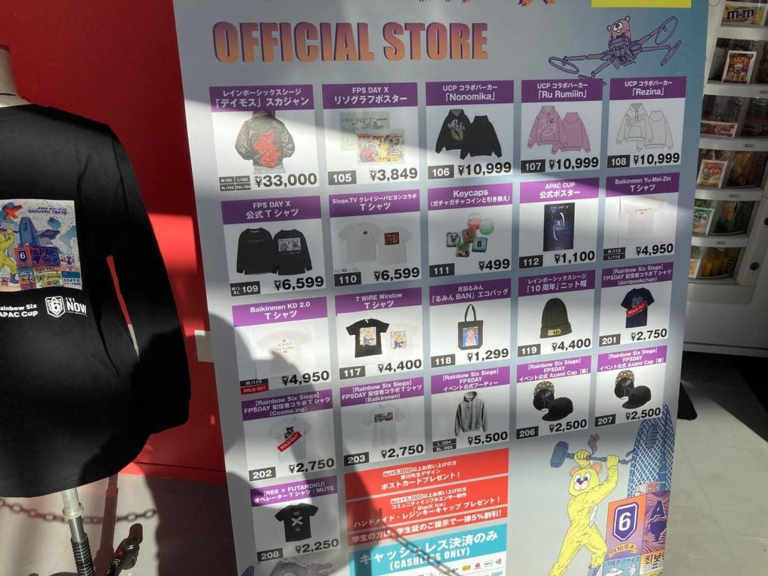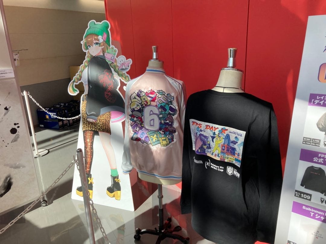 物販コーナーもかなり賑わっていた。とりわけ、『レインボーシックス シージ』と配信者がコラボしたTシャツは飛ぶように売れており、販売から瞬く間に売り切れとなった。サンプル商品も展示されており、参加者は思い思いに手にとって商品を確認することができる。売り切れ商品も出るという状況でありながらも、物販会場は落ち着いた雰囲気に満ちていた。