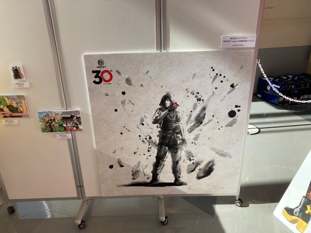 物販の待機列からは、Ubisoftが歩んできた歴史の節目に制作されたグッズを垣間見ることができた。筆者がとりわけグッときたのは、Ubisoftの日本オフィス設立30周年を記念して2024年に描き下ろされたイラストだ。『レインボーシックス シージ』のHIBANAが墨絵風のタッチで描かれているこのイラストはインパクトが抜群で、肉眼で初めて見ることができたのでついうれしくなってしまった。