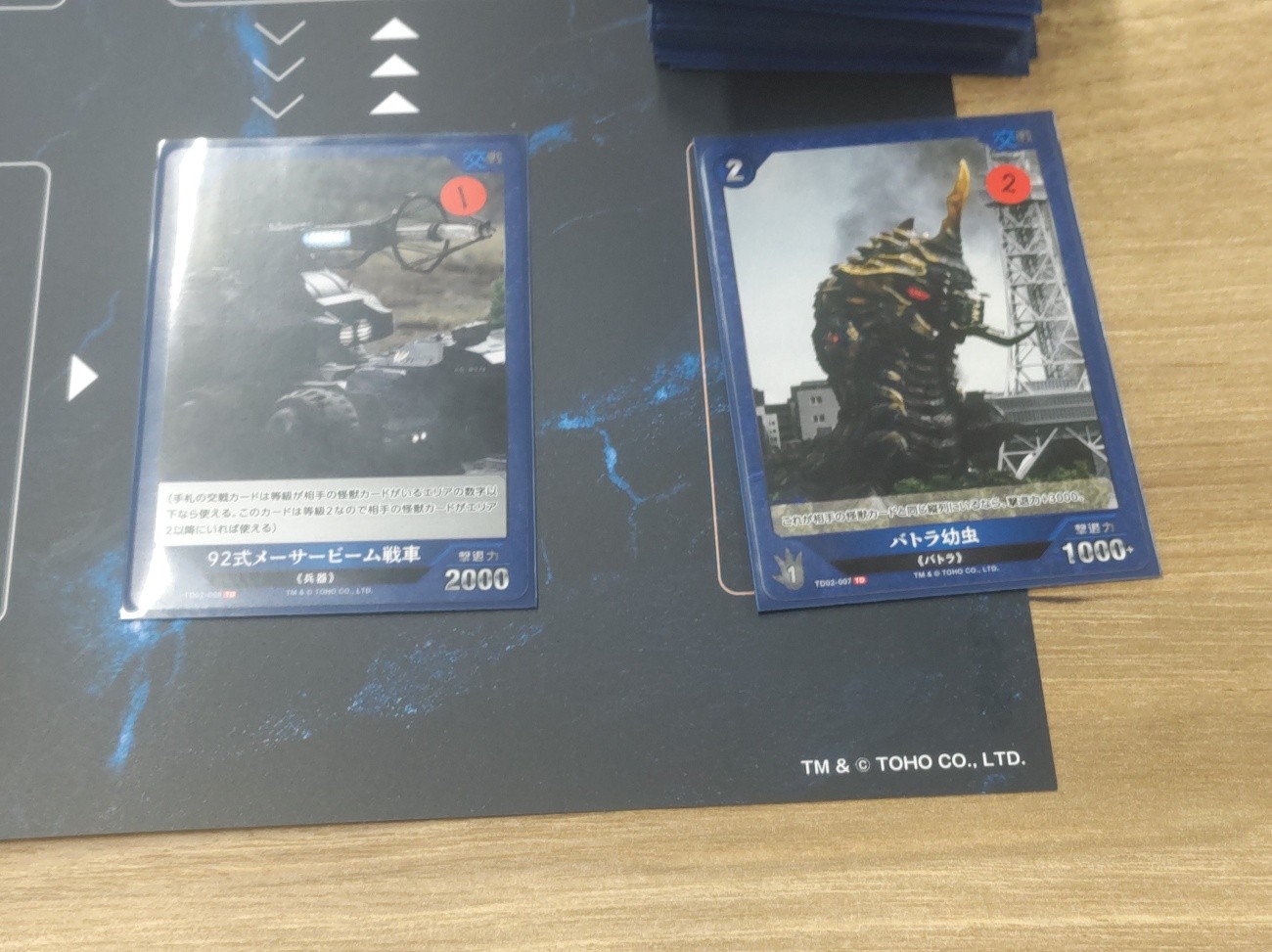 今回使用した2種類のティーチングデッキはそれぞれ、赤の『ゴジラ-1.0』デッキと青の『平成・VSシリーズ』だ。『ゴジラ-1.0』デッキには海神作戦で使用された船や劇中に登場した銀座の街などが交戦カードとして構築されていたほか、戦略カードとして海神作戦そのものも含まれていた。対戦相手の手札を強制的に2枚にしてしまう効果をもった、等級8にふさわしい強力なカードだ。一方の『平成・VSシリーズ』では、モスラやバトラといったゴジラのライバル怪獣が登場。1ターン無事に過ごせばデッキからモスラを直接出現させられる「モスラ幼虫」や、相手の怪獣カードと同じ縦列にいる場合撃退力が上昇する「バトラ幼虫」など、原作のイメージとマッチしたバリエーショ豊かな個性が加えられていた。