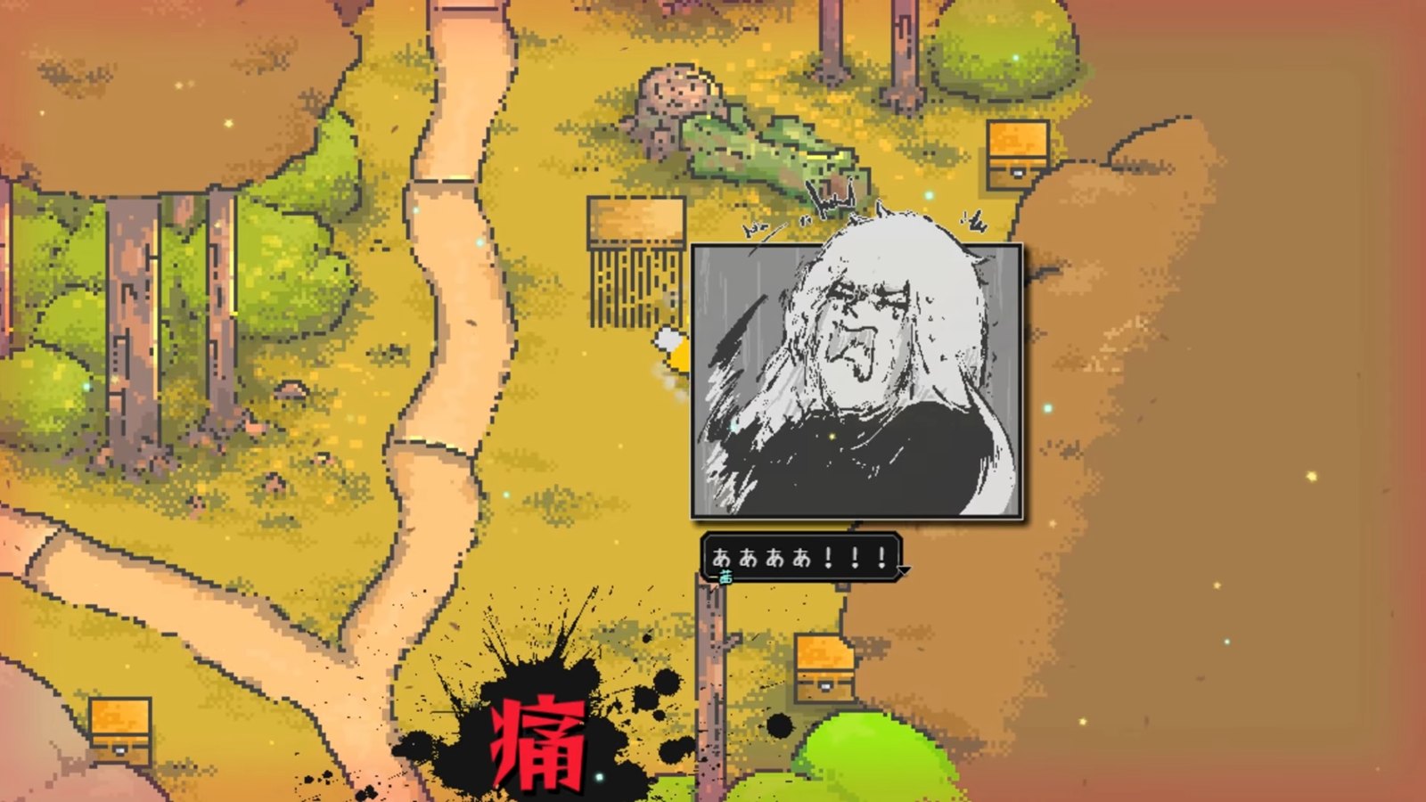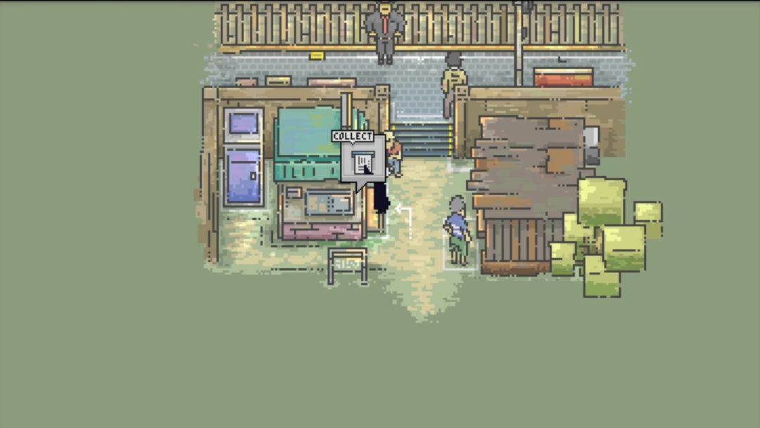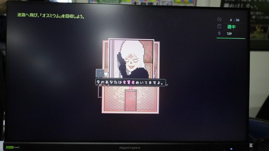 もうひとつ強く惹かれたのは、画面の中のものを全部触りたくなる細かなドット絵の演出だ。扉や自動販売機などにインタラクトでき、手元を拡大した吹き出しに詳細なアニメーションが描かれるという凝った演出が入る。ゴミ箱や小物に触れてもきちんと反応する動きは気持ちよく、ひとつひとつ確かめながら歩きたくなる。ドット絵は本来、記号的で省略の美学を持つ表現だが、本作は吹き出しと拡大演出によって、ドットの良さを損なわないまま詳細な情景描写に成功している。さらに漫画的なコマ割りのイラストや、デフォルメされた顔アイコンが挿入されることもあり、シンプルな画面に見えて密度は高い。情報を詰め込みすぎて画面が少し散らかって見える瞬間すらあるのだが、「できることは全部入れたい」という開発者の熱量が全面に押し出されていた。