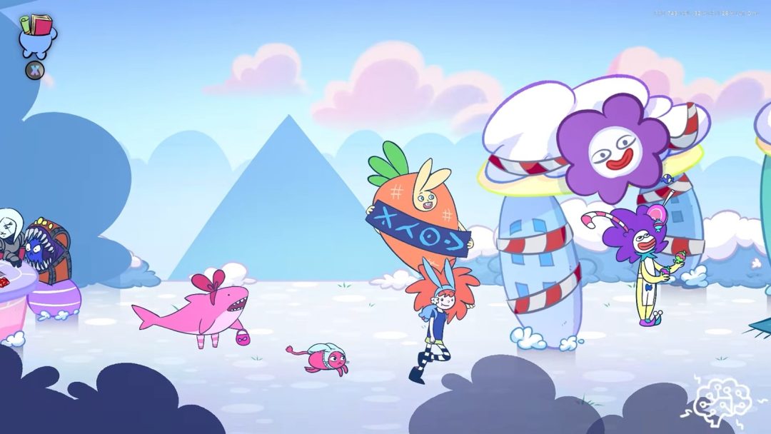 本作の奇抜さは演出にも活かされている。プロローグでは、母を追いかける場面で一瞬だけ黒い世界が差し込み、空気が急に変わる瞬間がある。アイスクリーム型の家が並ぶ、いかにもファンタジー然とした背景の奥には、いつの間にか荒廃した電柱が立っている。可愛らしい世界に見えて、どこか綻びがある。徐々に、『Apopia』の世界がただ面白おかしい夢ではないことがわかってくる。