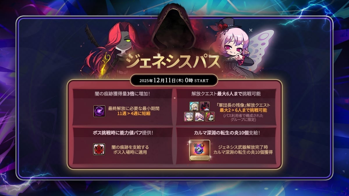 また、新規プレイヤーだけではなく、既存・復帰プレイヤーにとっても注目のコンテンツが追加される。まずは、「ジェネシス武器」の解放を大きく助ける「ジェネシスパス」が12月11日よりスタートする。ボス挑戦時には能力値バフを得られるだけでなく、パス利用者で構成されたグループならば最大6人(パスなしでは2人)で協力して「軍団長の残像」解放クエストに挑める。専用ドロップ素材の量も実に3倍となり、魅力的だ。