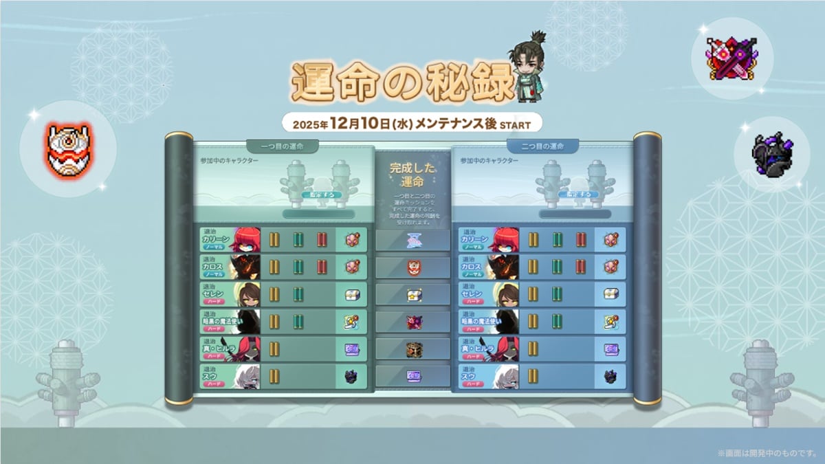 さらに、「運命の秘録」では2名のキャラクターそれぞれでミッションを達成することで、超豪華な確定報酬を獲得することができる。レアドロップ品相当の価値あるアイテムを、確実に手に入れる貴重なチャンスだ。なお、各ボスは12月10日から1番目のキャラクター、2026年1月21日から2番目のキャラクターで挑戦可能である。ぜひチェックして忘れずにゲットしてほしい。