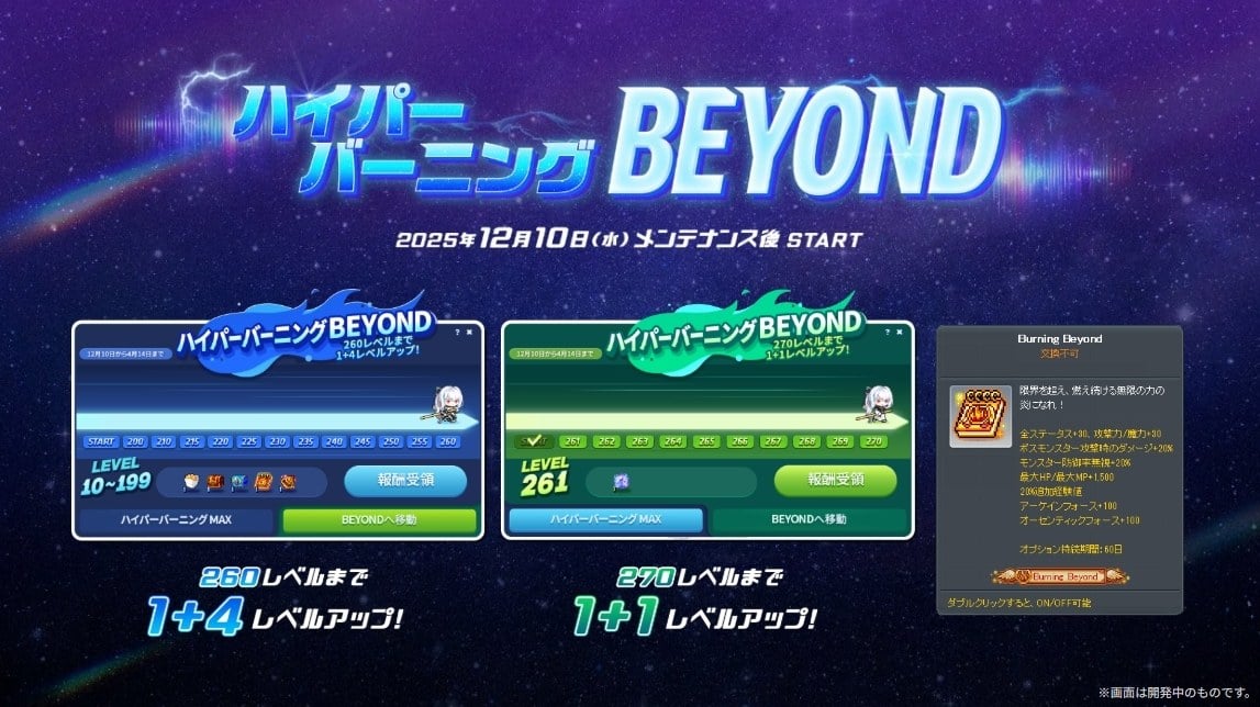 ワールド限定イベントの「謎の結界」と、これだけではなく、新しい成長支援システム「ハイパーバーニングBEYOND」を通じて素早く270レベルまで到達できるようになった。新たな成長支援ハイパーバーニングBEYONDは、従来のハイパーバーニングより高レベルまでの育成を手厚くサポート。LV.260までは1+4でレベルアップ、LV.261~270の区間も1+1ずつレベルアップで成長するため、強力なボスに挑むためのレベル条件を従来よりも早く達成することが可能となっている。
