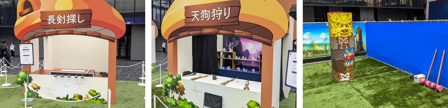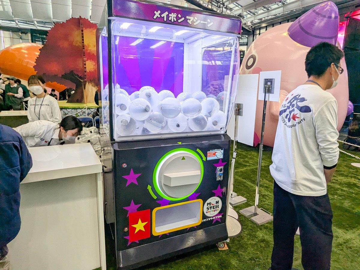 ミニゲームについては、射的でモンスターの的を倒す「天狗狩り」、くじ引きで長剣を引き当てる「長剣探し」、そして超高難易度のダルマ落とし「TOTEM PANG! PANG!」が楽しめた。参加者は、これらのミニゲームを3種クリアすると特別なコインをゲットし、ゲーム内でもおなじみの巨大ガチャ「メイポンマシーン」を回すことができる。そのため、すべてのミニゲームに参加者が詰めかけ、「難しすぎないものの失敗の可能性が十分ある」といった塩梅のミニゲームに一喜一憂の声をあげて盛り上がっていた。