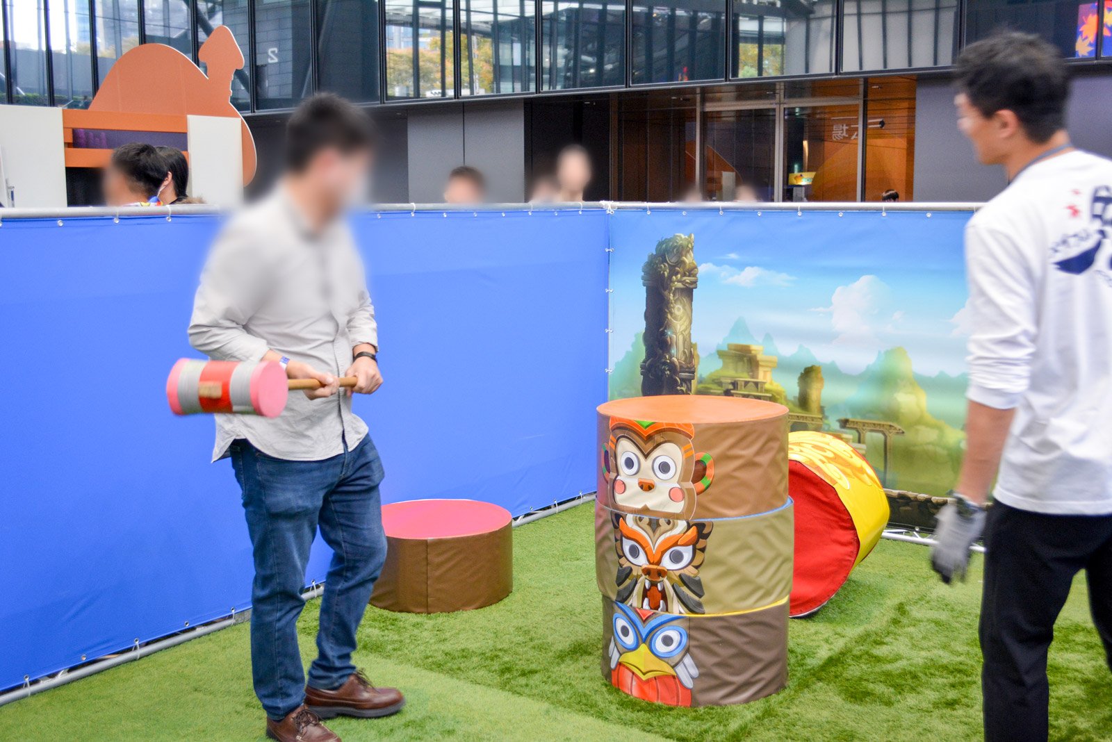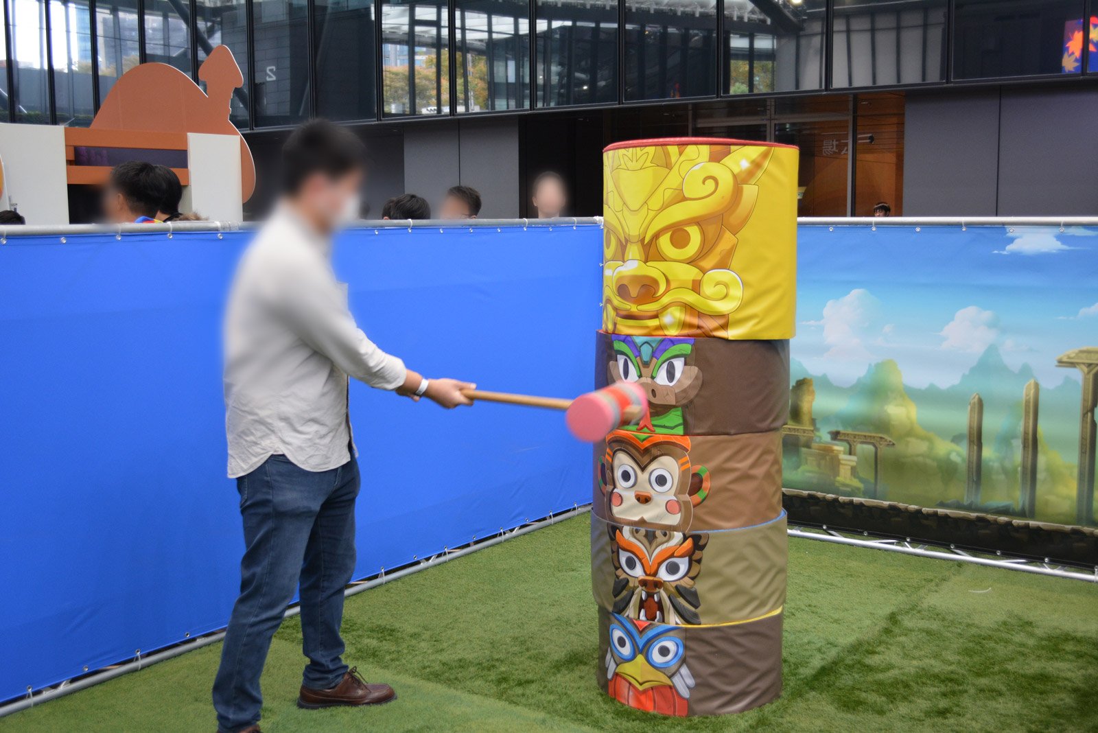 中でも特に盛り上がっていたのが、「TOTEM PANG! PANG!」だ。『メイプル』プレイヤーにはランダムポータルでお馴染みのミニゲーム「トーテムスラッシュ」を現実に再現したようなアトラクションとなる。このミニゲームは極めて難易度が高く、常に挑戦者や観客の「あぁー!!」「惜しい!」といった悲鳴が耐えない状況だった。筆者も挑戦したものの、結構な重さのハンマーに振り回されあっけなく失敗。しかしながら、成功者も数人いたそうで、どれほどの剛腕だったのか想像できない。