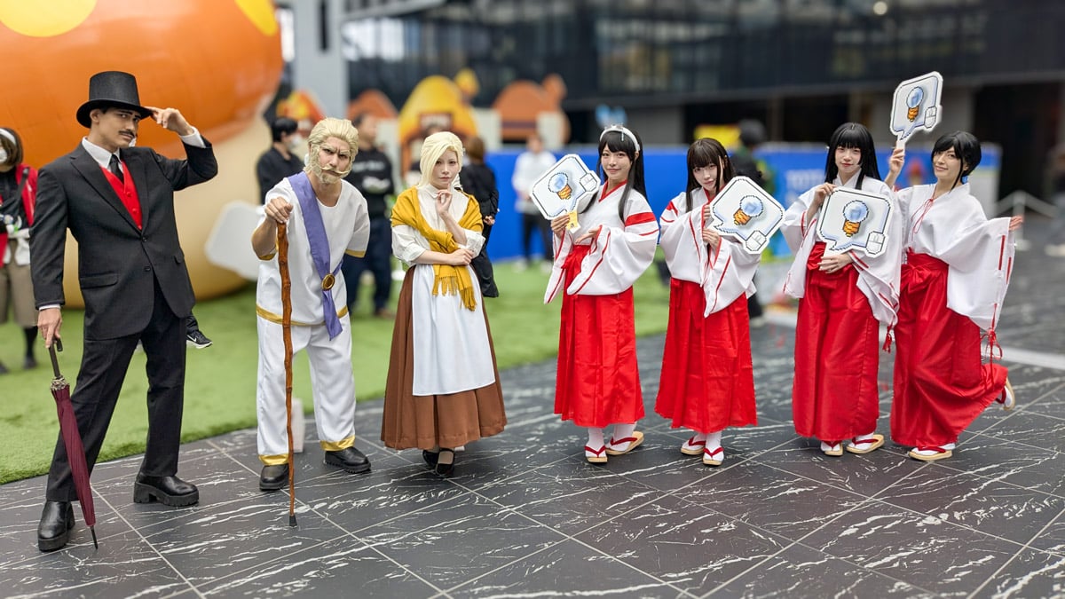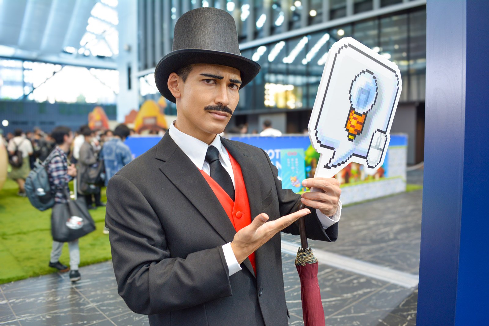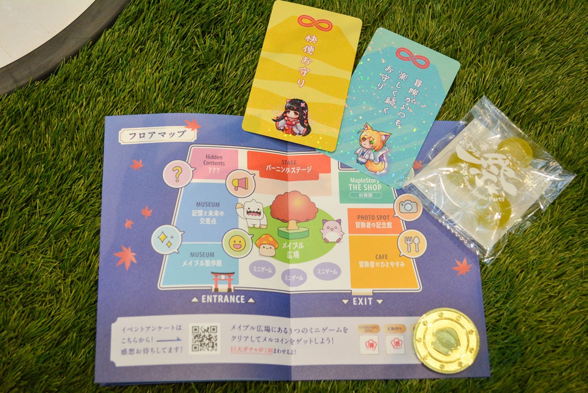 そうした遊びの合間に目を引くのが、『メイプル』のNPCに扮したキャストたちだ。関西風にいえば「えらいシュッとしたシュピゲルマン」を始めとして、長老スタン・Mrs.ミンミン・カサンドラ・キノコ神社の巫女たちといった印象的なNPCたちが揃い踏みしていた。いずれのNPCもプレイヤーお馴染みの「電球マーク」を掲げて会場内を闊歩しており、マークを“クリック”するとジャンケンミニゲームが開始。勝利すればおまもりカードが、一発勝利ではグミが“報酬”として貰えた。『メイプル』の中に入ったような気持ちになれる、見ているだけで飽きないアトラクションとなっていた。