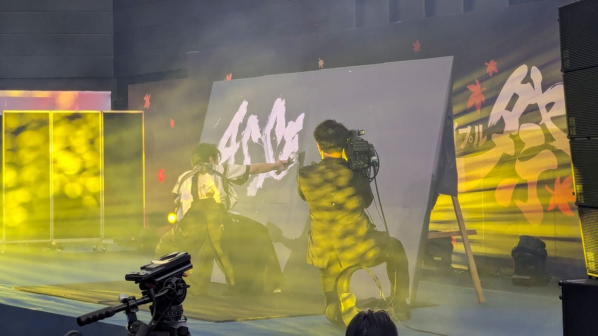 やがて、ステージの雰囲気が変わると“リアル”レンが登場。その姿を披露した後には、意表を突くように書道家の杉田曠機(すぎた こうき)氏が登場した。一体何事かと観客が固唾を呑んで見守るなか、杉田氏が入魂の筆づかいでしたためたのは「ASSEMBLE」の文字。そして、同アップデートの詳細が11月30日の生放送番組「WINTER SHOWCASE 2025 “ASSEMBLE”」にて明かされると告知された。なお、レンの事前登録キャンペーンについても案内があり、12月10日メンテナンス前までの登録で特別報酬が貰えるとのこと。