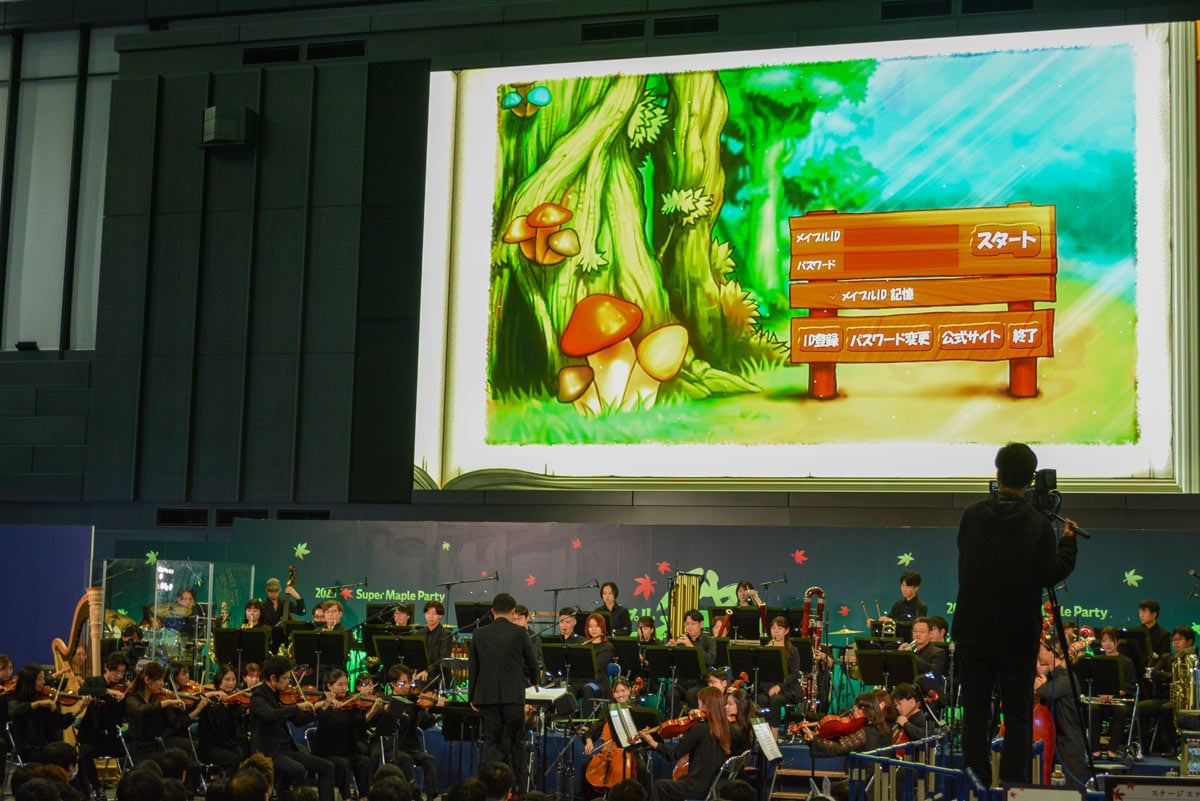 幕開けの1曲は、プレイヤーなら誰もが耳馴染みのある「ログイン画面」のBGM。いつも聴いているはずの曲が、オーケストラの力もあってぐっと胸に染み入ってくる。そして大スクリーンに映し出された「初期『メイプル』のログイン画面」に不意を打たれた筆者は、胸にふたたび去来する「ゲームと音楽だけが友達だった子ども時代」の記憶を呼び起こされ、気づけばボロボロと泣いていたのだった。