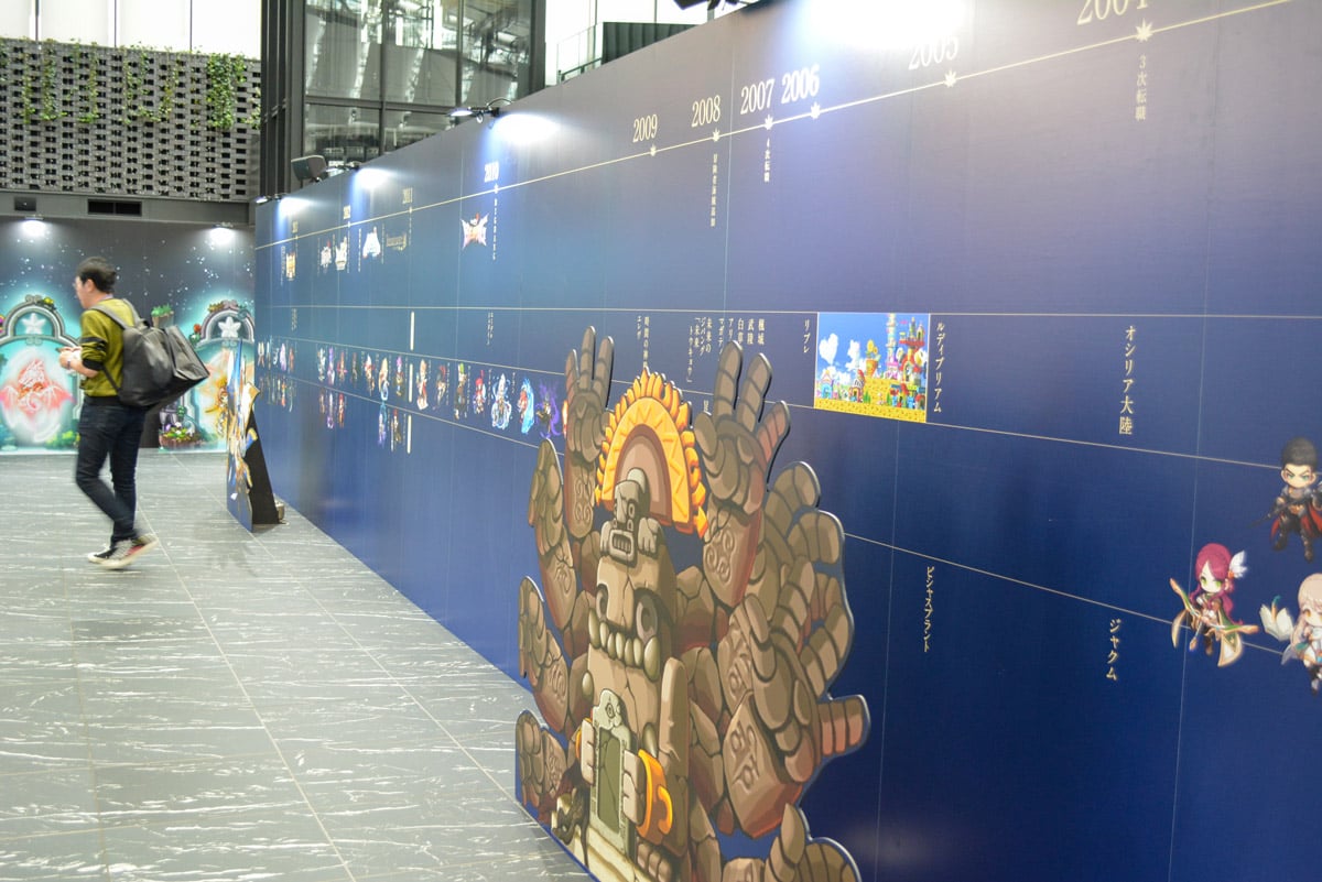 驚きもそこそこに、筆者も群衆のひとりとなって本イベントを楽しませてもらった。まず入場者を出迎える「メイプル散歩道」では、壁に刻まれた年表とアートワークにより、本作の長い歴史を振り返ることができた。思い出の振り返りだけでなくアートの展覧としても楽しめる丁寧な内容で、筆者などは「ゲームと音楽だけが友達だった子ども時代」がフラッシュバックしていきなり崩れ落ちそうになった。そうしたノスタルジーは他所に置いても、『メイプル』が大切にしてきた世界観がよくわかる展示だ。