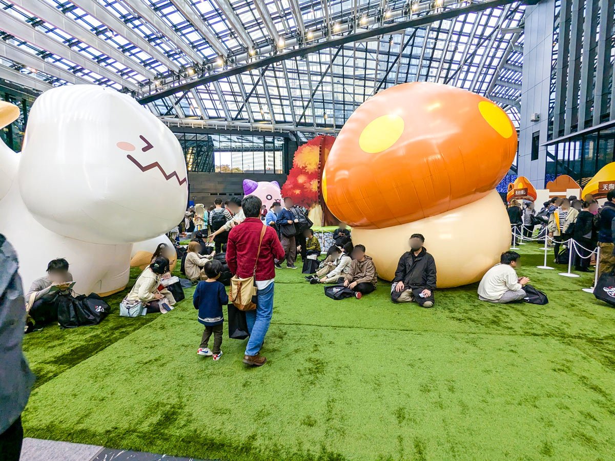 散歩道を通り抜ければ、『メイプル』を象徴する存在であるメイプルキノコ・イエティ・ピンクビーンの巨大バルーン、そして「モミジの木」がお出迎え。この一帯は「メイプル広場」と名付けられ、芝生仕立ての床では『メイプル』ゲーム内さながらに参加者たちが足を休めて交流したり、憩いのひとときを過ごしたりしていた。