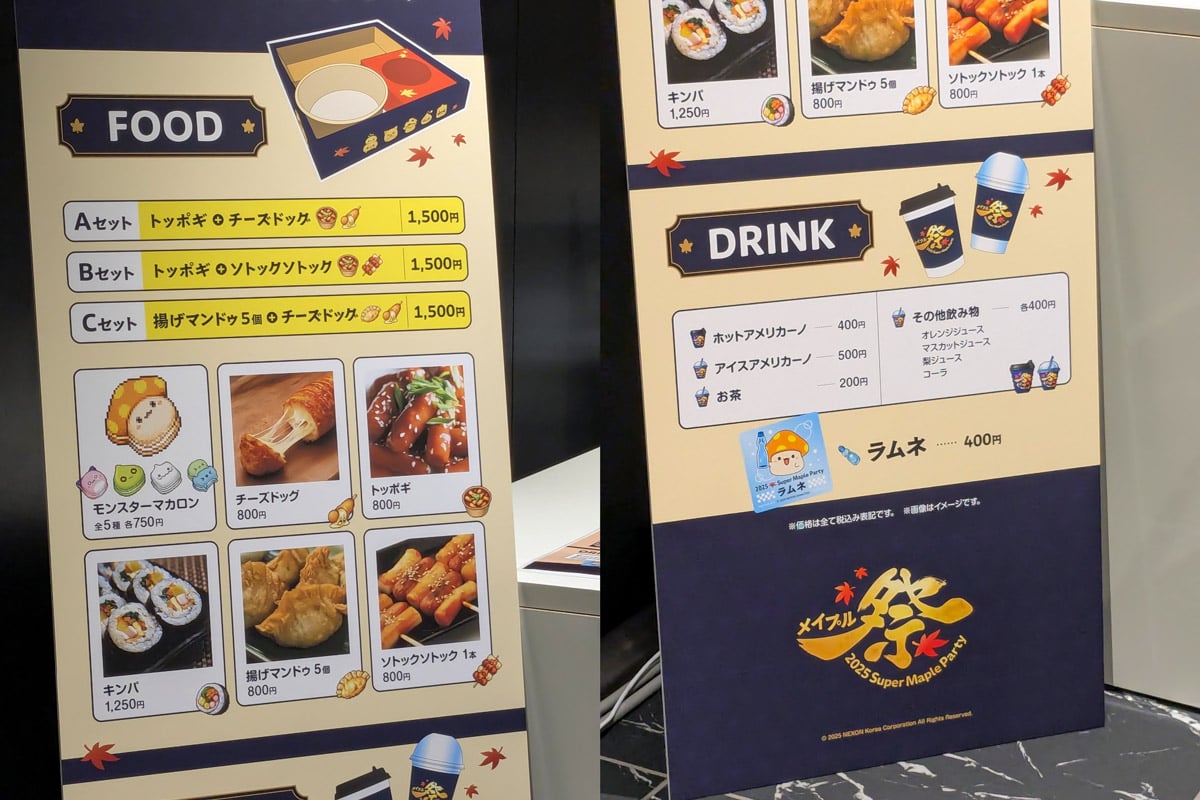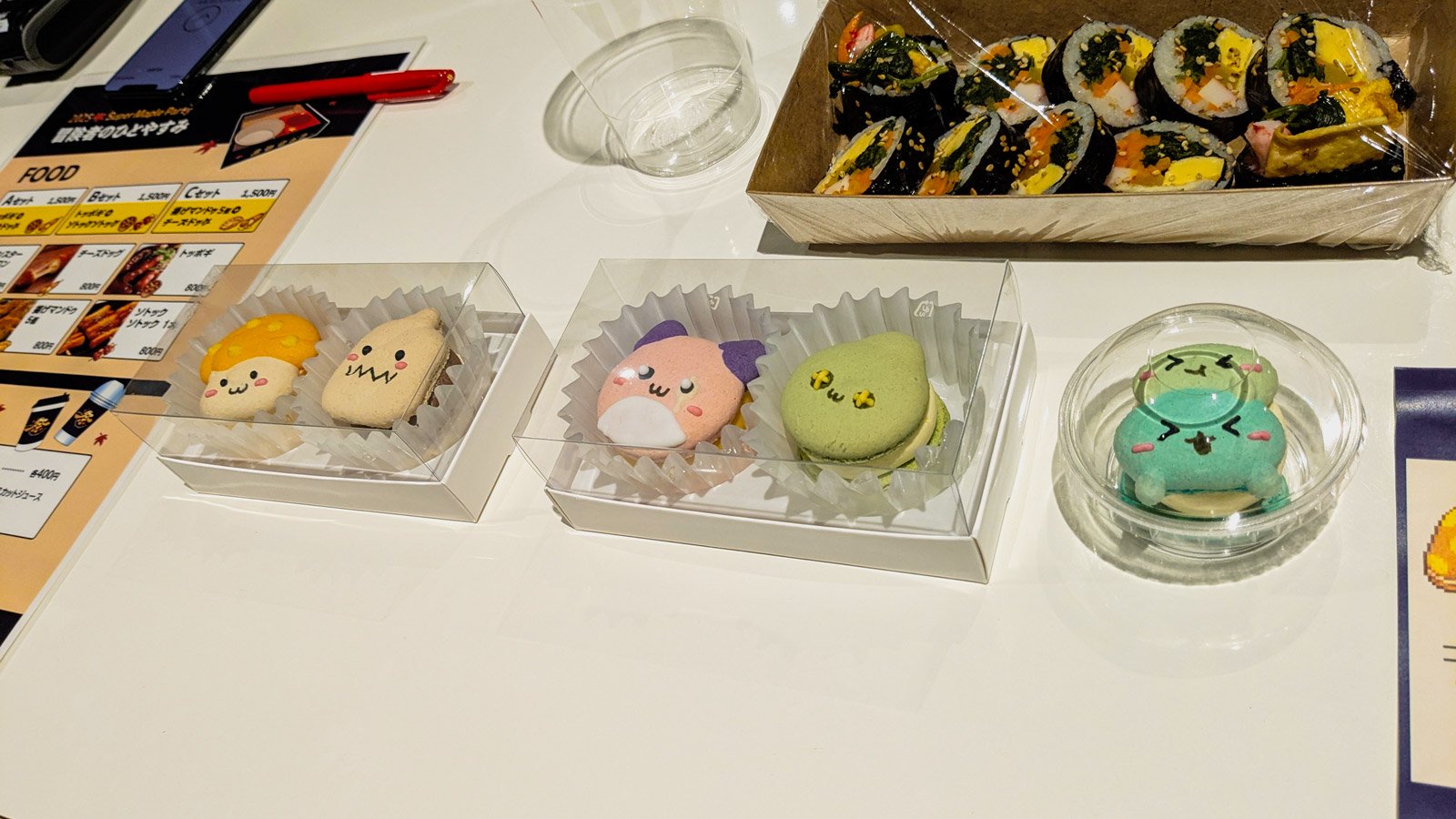 本イベントでは、フードやミニゲームもさまざま提供され、まさにお祭りさながらの活況となっていた。フードについては、トッポギ・キンパ・揚げマンドゥなど韓国グルメを中心としつつ、メイプルのモンスターたちが可愛らしくデザインされた「モンスターマカロン」を提供していた。