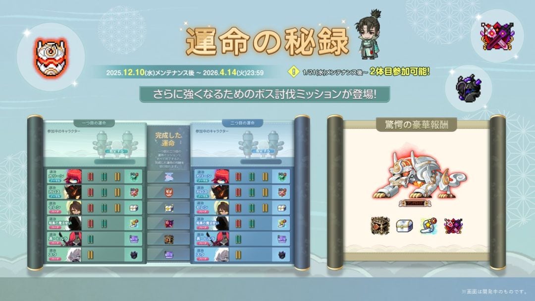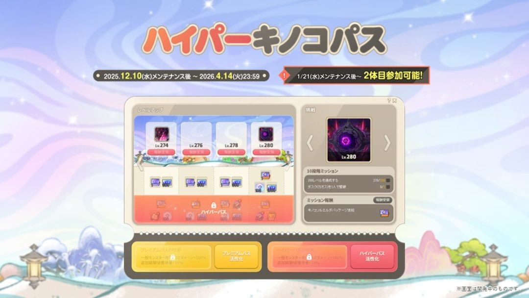 さらに、ミッション達成で豪華報酬が手に入る「運命の秘録」では2キャラ目が解禁。280レベルまで充実した報酬を受け取れる「ハイパーキノコパス」についても、2体目が参加可能となる。「ジェネシス武器」の解放を助ける「ジェネシスパス」も2体目分が追加で購入できるように。第1弾に続いて第2弾アップデートでも、育成に拍車がかかるイベントが始まるわけだ。