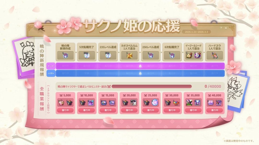 1月21日の「暁の陣」改変にあわせて育成支援イベント「サクノ姫の応援」も開催される。こちらのイベントでは、カンナもしくはハヤトを作成し目標を達成するごとに支援アイテムを獲得可能。育成に役立つアイテムのほか、改変前の姿のアバターも手に入るとのことだ。
