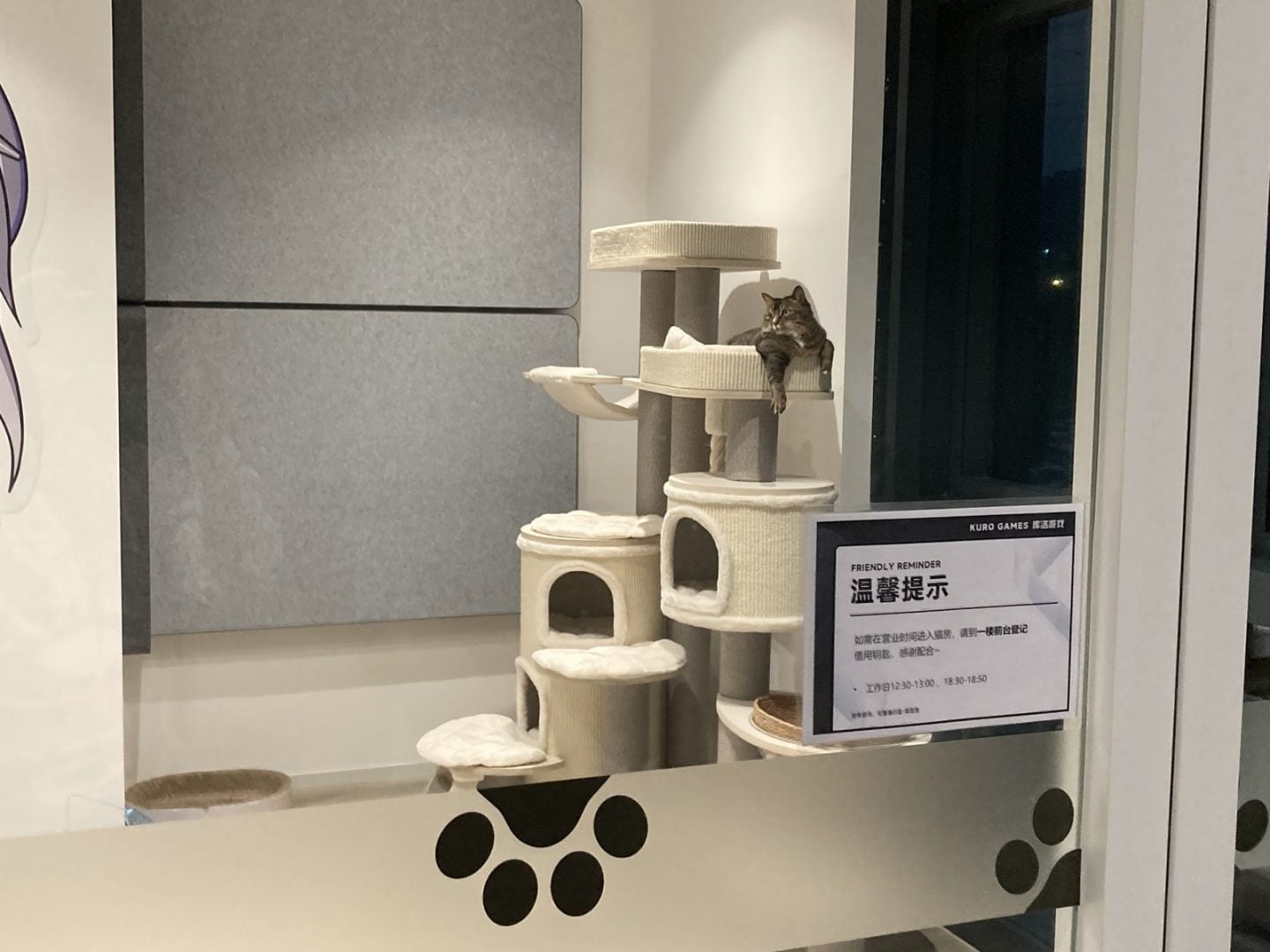 KURO GAMESの猫はかなり人懐っこく、訪問客にも興味津々だ。キャットタワーからこちらを覗き見ているところが、なんとも愛らしい。最初は警戒していた素振りを見せていたが、すぐにリラックスした状態で過ごしていた。こちらとしては猫にストレスを与えてしまっていないか心配していたが、どうやらそうではなさそうなので安心した。『鳴潮』の開発陣にも猫好きは多く、暇を見つけては猫に会いに来るそうだ。