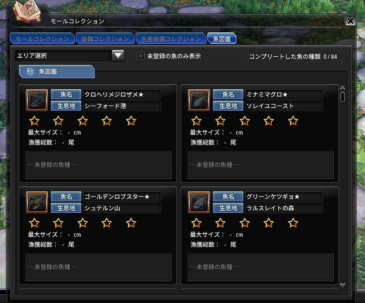 釣った魚の図鑑というのは、生活スキルの中にある釣りの釣果を表すものだ。生活系のスキルとしては、釣り・考古学・採集・料理の4種の「生産スキル」が存在する。釣りの場合は場所や餌の種類で釣れるものが変化し、各魚ごとに5段階のサイズ情報も持っている。各釣りポイントには「ヌシ」が存在するので、ヌシ釣りをしてトロフィー集めをするという要素がとてもやり込み甲斐があって楽しそうだ。