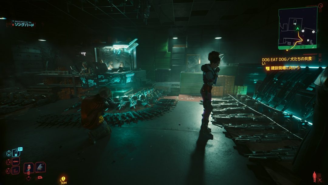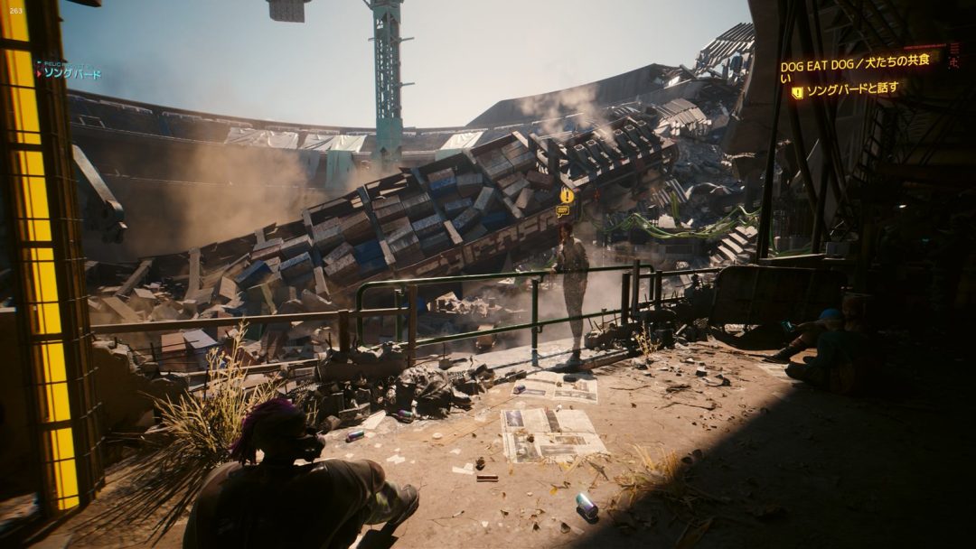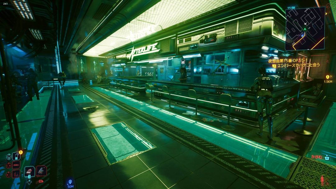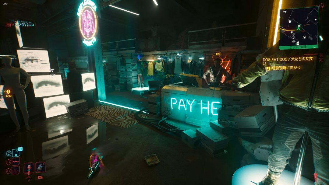 まず驚かされたのは、6Xモードが想像以上に自然に動いていたことだ。ブラックマーケットは人通りが多く、ネオンや蛍光灯、積まれた電子機器からの間接光も多いかなり負荷の重いロケーションである。しかも今回は別格に処理の重い、パストレーシング込みの設定だ。相応の重さを覚悟していたが、実際に歩いてみると拍子抜けするほど動きが軽い。一方で、水溜りに反射する光の質感や、柔らかい影などの表現力が明確に向上しており、しっかりとパストレーシングが効いたうえで快適な動作を実現していることがわかる。