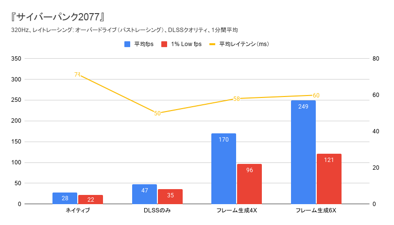 遅延(レイテンシ)についても、ベンチマーク上では4Xモードの平均47msに対し、6Xモードでは平均50msとわずかに増加していたが、体感差は感じなかった。一方で、フレーム生成を使わないDLSSのみの状態と比べると約10msの差が生じており、PvPタイトルではこの差も惜しいと感じるプレイヤーはいるだろう。ただ、少なくとも今回のようなシングルプレイ作品では、その差以上に高画質かつ高フレームレートで遊べるメリットのほうが強く感じられた。