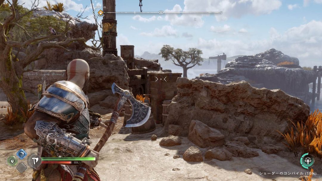DLSS 4準拠の4Xフレーム生成をONにしてみると、斧を構えた際のクロスヘアやコンパスなどの固定UIが、振り返りや戦闘といった動きの激しい場面でわずかに乱れ、ブロックノイズ状のざらつきが出ることがあった。動きやモーションを加味してAIが補完するフレーム生成では、背景は動かしつつ、一部のUIは固定するという使い分けが難しいのだろう。見逃してしまう程度の小さな乱れではあるが、一度意識すると気になってしまう部分でもある。