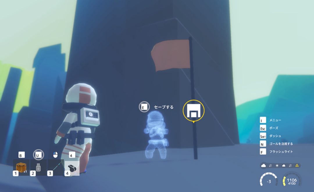 『南極計画』を触ってまず印象的だったのは、ローポリ寄りの見た目から受ける柔らかな印象に対して、ゲームプレイはかなり容赦がないことだ。氷壁に囲まれた閉塞感のある風景は美しく、臨場感のある音で南極らしい孤独が演出されている。しかし、景色に見とれている余裕はあまりない。歩くだけでバックパックの燃料はぐんぐん減っていき、回復アイテムを使おうとする間も時間は止まらない。プレイ中は常にじわじわと追い立てられるような焦りがつきまとう。