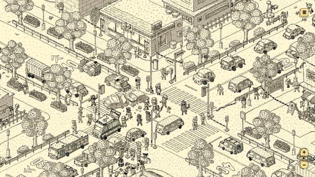 本作でまず目を引くのは、すべてボールペンの手描きで構成されたアートスタイルだ。淡い黄色と黒を基調にした色使いはシンプルだが、街に出た瞬間の情報量には驚かされる。キャラクターはよく動き、画面のあちこちに細かな描き込みがある。ポップで親しみやすい見た目ながら、その作り込みには執念すら感じた。