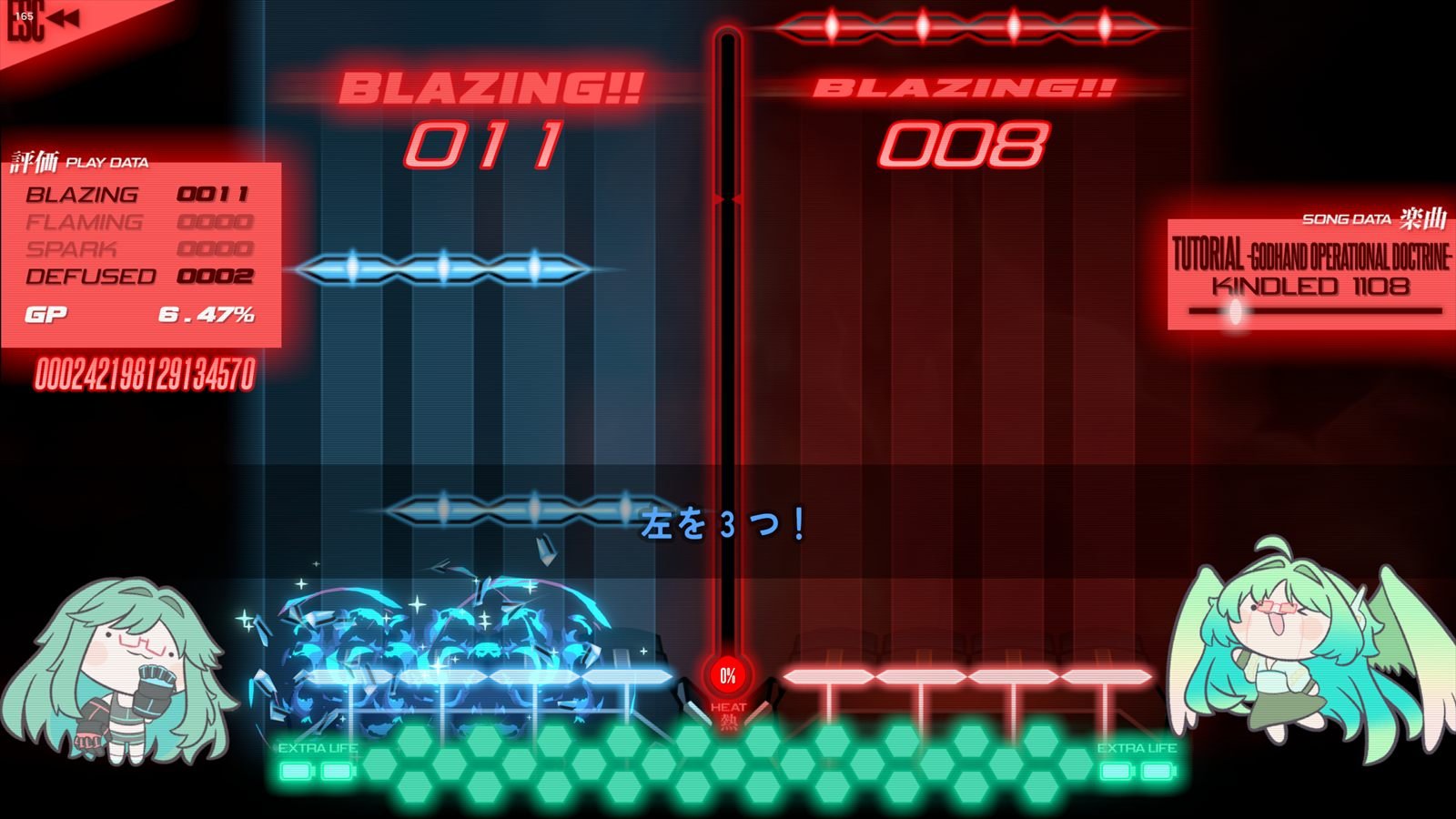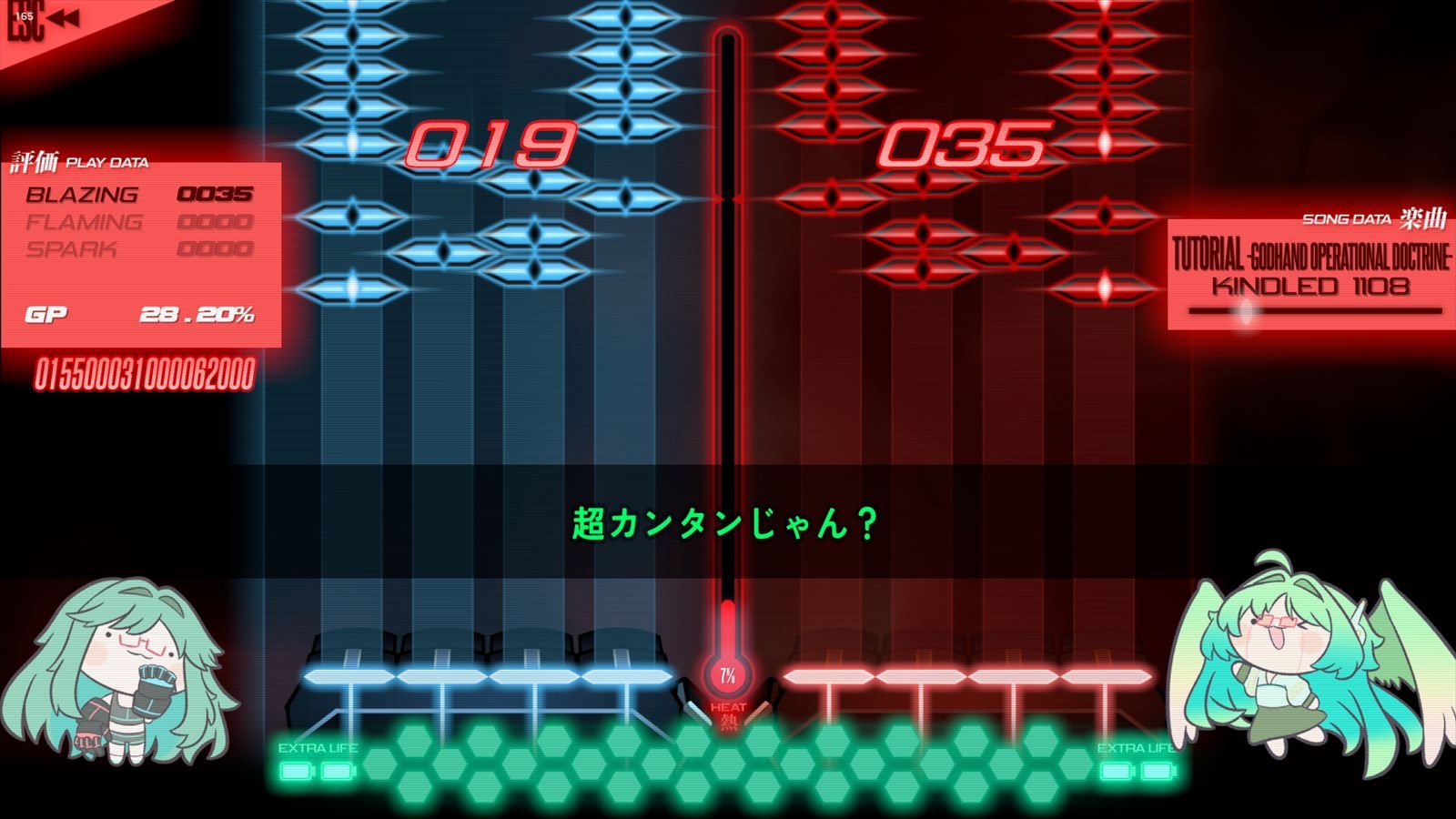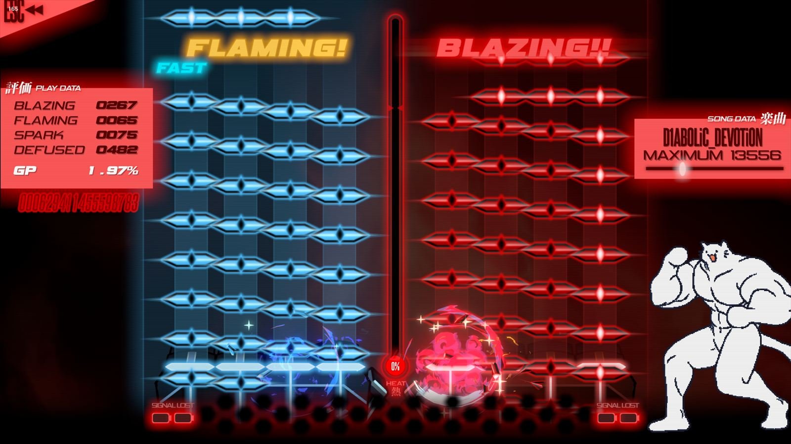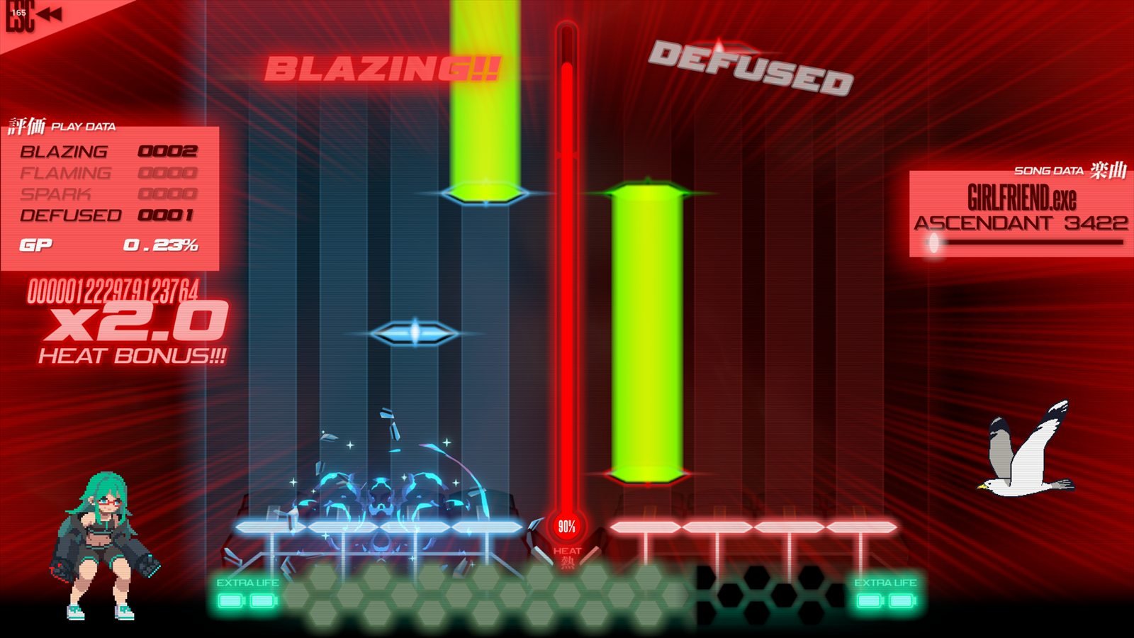 実際にプレイしてみると、ヒートゲージがMAXになった瞬間、派手なエフェクトとともに左側に「×2.0」と表示される。わずかなミスで体力が大きく下がり、緊張感と高揚感が同時に襲いかかる。“暴力的な操作と精密な判断”――この感覚が、本作を単なるバカゲーで終わらせていない。