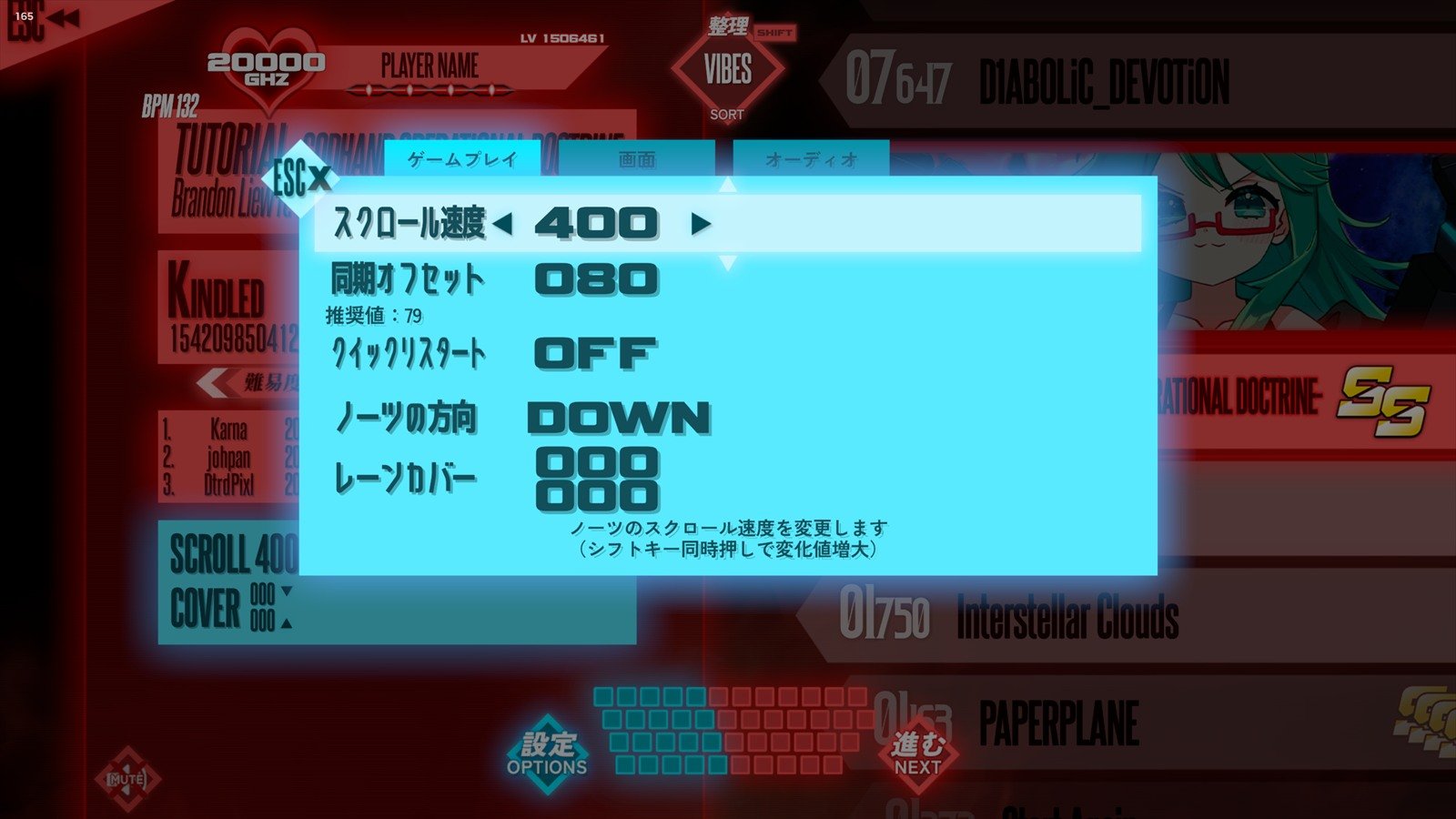 操作設定も充実しており、スクロール速度や方向、ノーツ判定のタイミング(オフセット)調整など、一般的な音ゲーが持つ要素は一通りそろっている。判定の早遅を教えてくれる支援機能もあり、「キーボード破壊系超絶連打リズムゲーム」というネタっぽいキャッチコピーに反して、本格音ゲーとしての下地がしっかりしている。