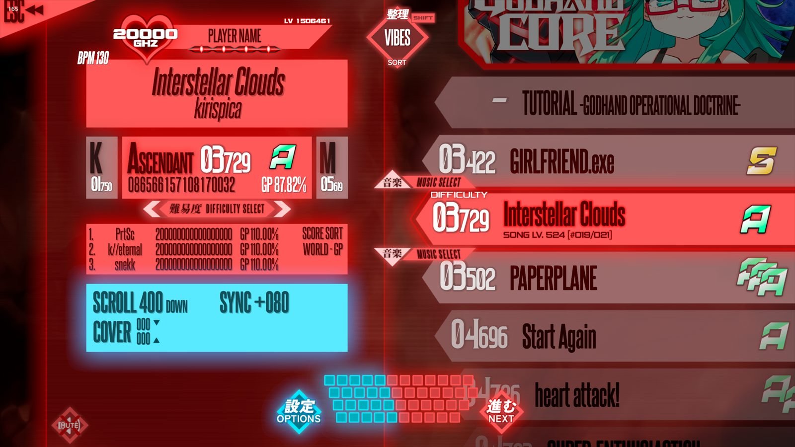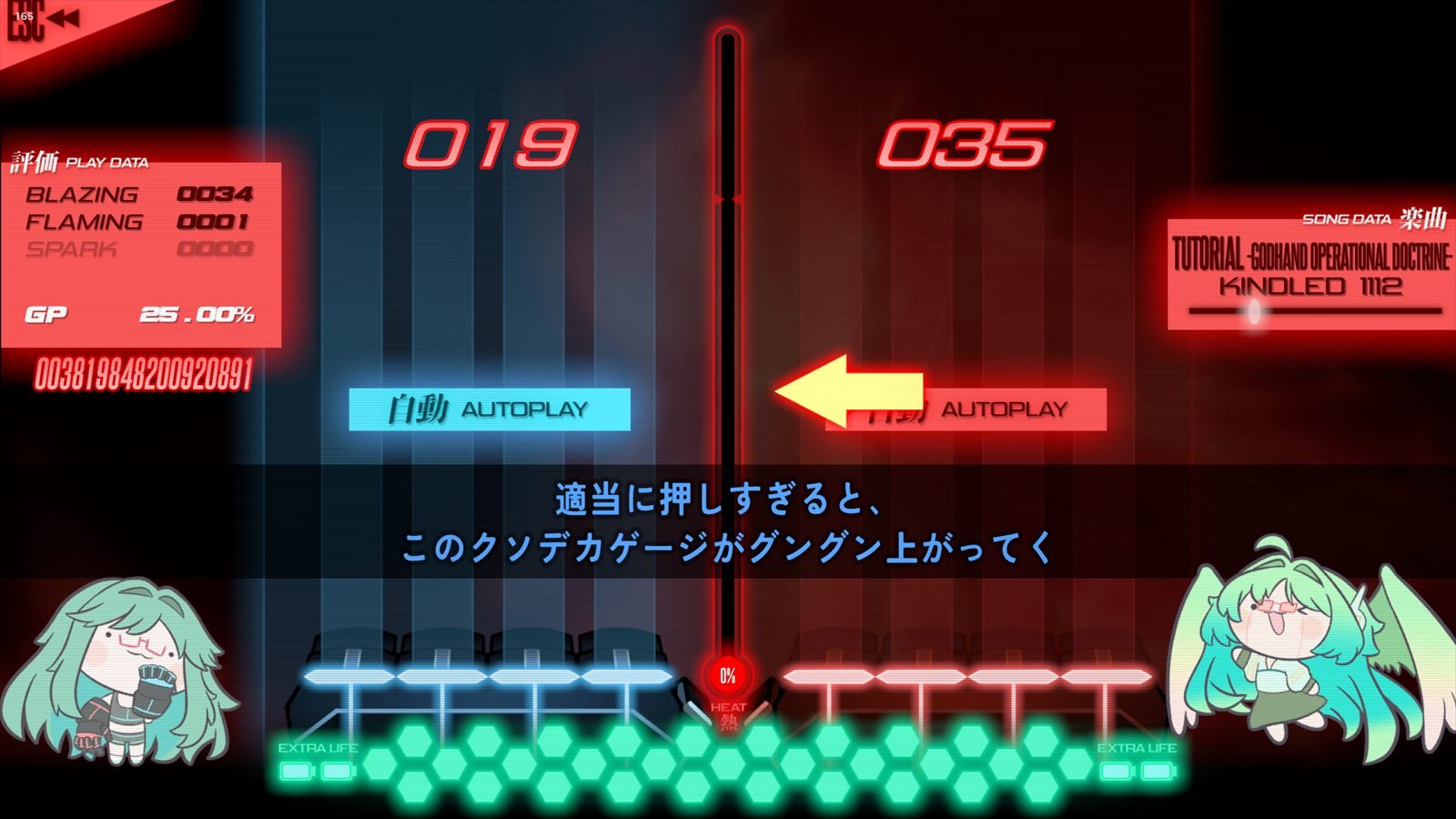 『PROJEKT GODHAND』のユニークさは、スコアシステムにもある。画面中央には「ヒートゲージ」があり、ノーツ以外の入力やマッシュノーツ(指定回数以上の連打)で上昇する。このゲージを上げるとスコア倍率が増すが、同時にノーツ判定が厳しくなり、ミス時のペナルティも大きくなる。リスクとリターンの両立が求められる仕組みだ。