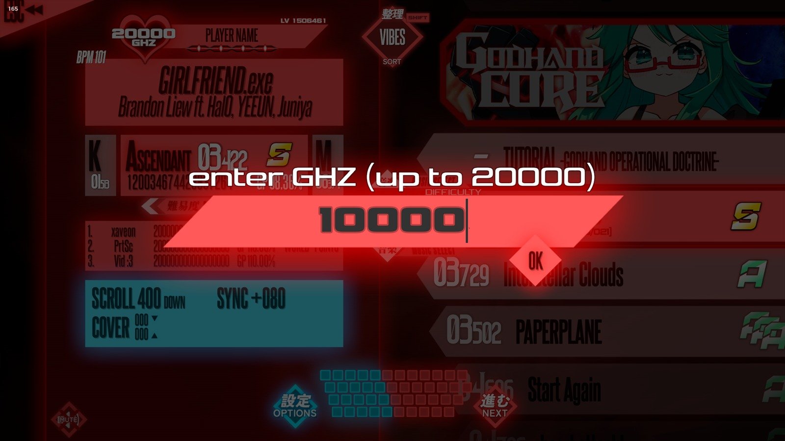 もうひとつの象徴的な仕組みが、プレイヤーの熟練度を示す「GHZ」だ。これはプレイヤーの成績に合わせて上下することはなく、自分で好きに設定できる。「GHZ10000」にしたければそれでよし。いきなりMAXの「GHZ20000」に設定しても構わない。今後追加されるストーリーモードやチャレンジモードでは、この数値によって難易度が変化する予定だという。