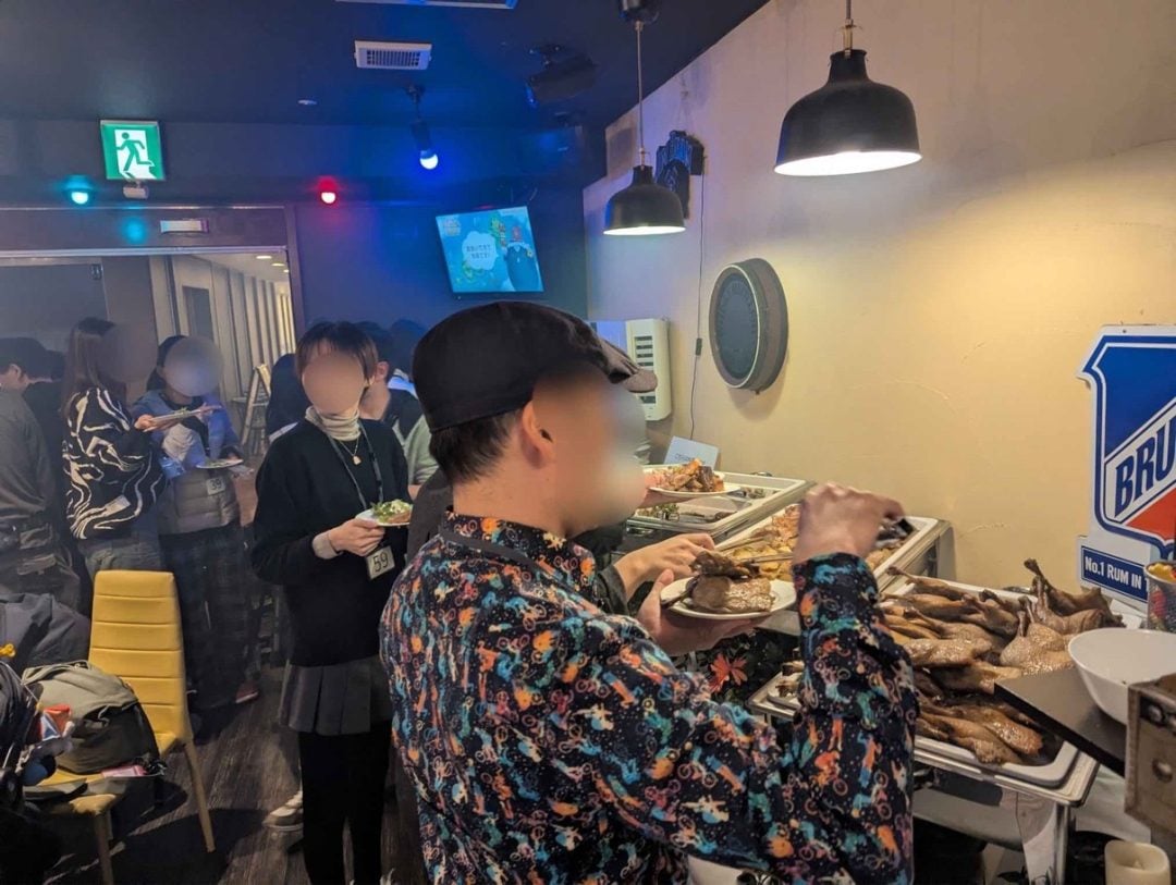 会場で目を引いたのは、所狭しと並べられた料理の数々だ。骨付き肉やピラフ、焼きそば、サラダなど、バラエティ豊かなメニューがずらりと用意されていた。参加者はバイキング形式で好きな料理を自由に取り分けることができ、お皿いっぱいに料理を盛り付ける人の姿も多く見られた。そして、今回の目玉はなんといっても1ポンドステーキだ。BBQらしくその場で焼き上げられ、会場には香ばしい煙が立ち込めていた。参加者は席で食事をしながら一連の催しを楽しむことができ、会場全体は終始にぎやかな雰囲気に包まれていた。