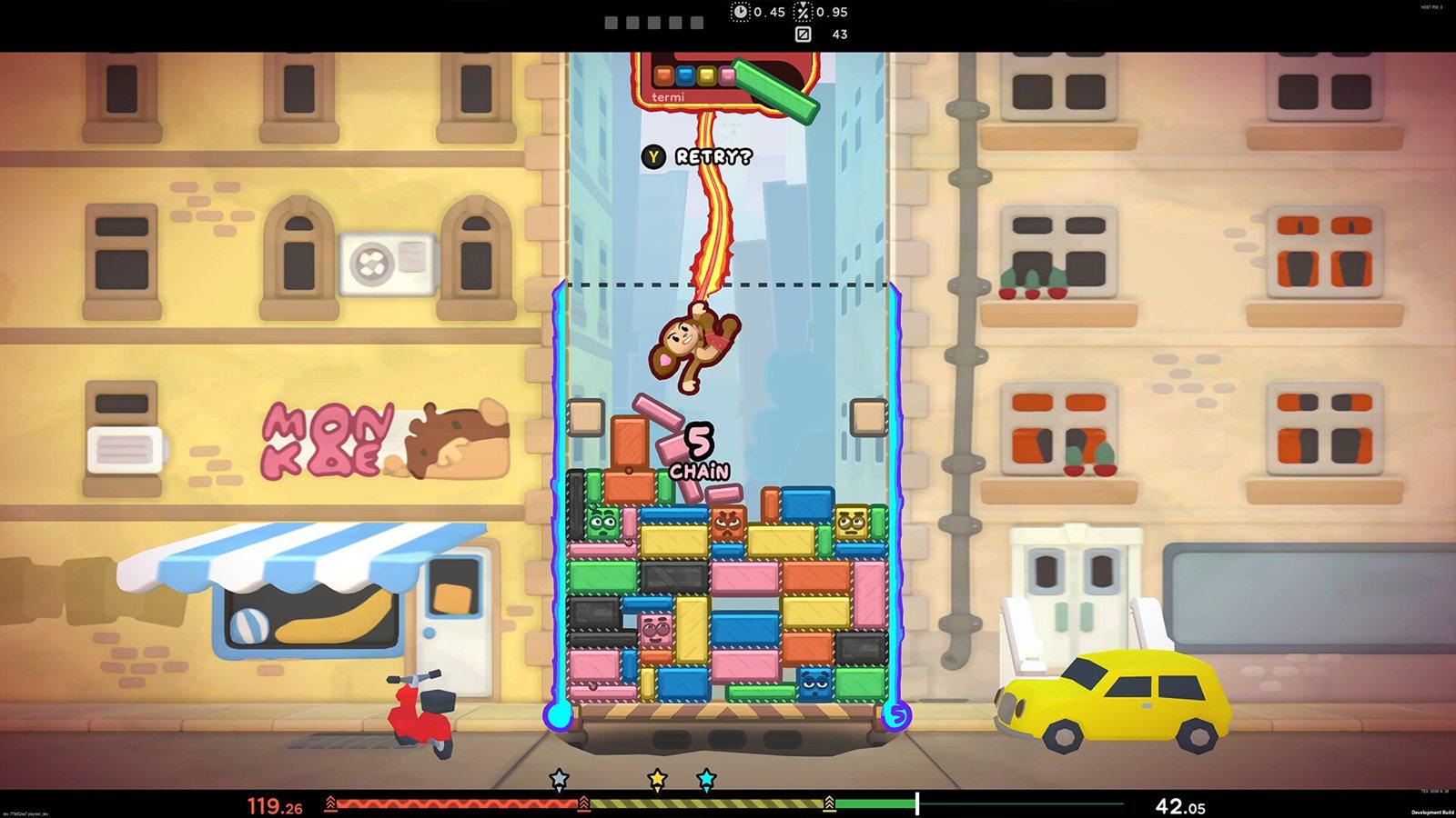 ブロックは勝手に落ちていくようなことはなく、バンジーにより上下左右に移動も可能。自分のペースでブロックの置き場所を考えられため、リアルタイムで動き続けるタイプのゲームより遊びやすい。ただバンジーが伸び縮みするせいで動きがふわふわとしており、ブロックを狙ったところに持っていくのが微妙に難しい。独特の動きに苦戦しつつ、それでも同じ色のブロックを集めて消していく。