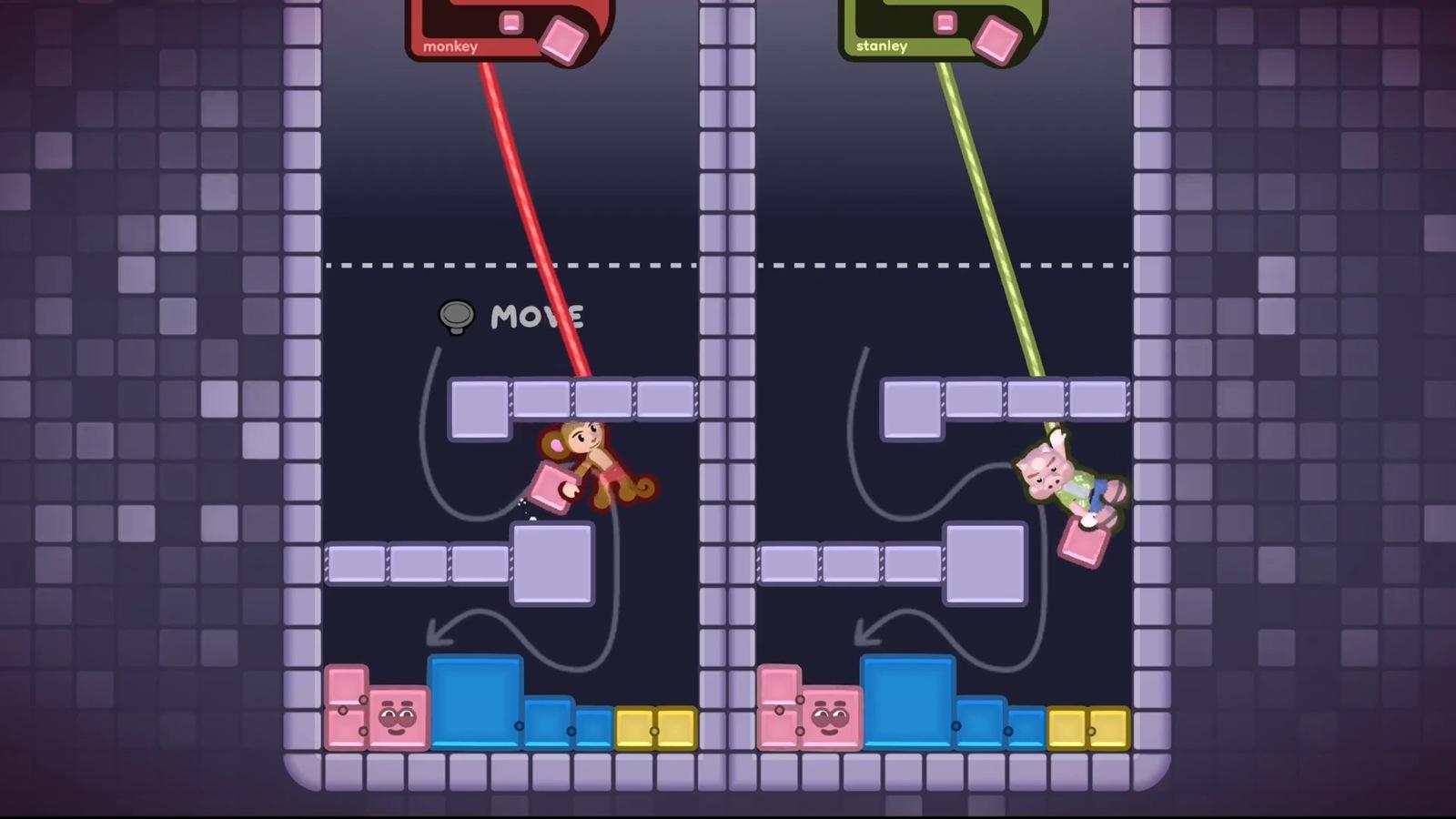 ブロックは同じ色のものを4つ繋げると消せるというルールだ。実際にゲームを始めると、バンジー(ゴム紐)にぶら下がった動物を操作して画面を降りていき、ブロックを置いていくことに。落ちものパズルゲームとしてはベーシックなルールのためやることはわかりやすく、ほとんど説明なしでスムーズに遊び始められた。