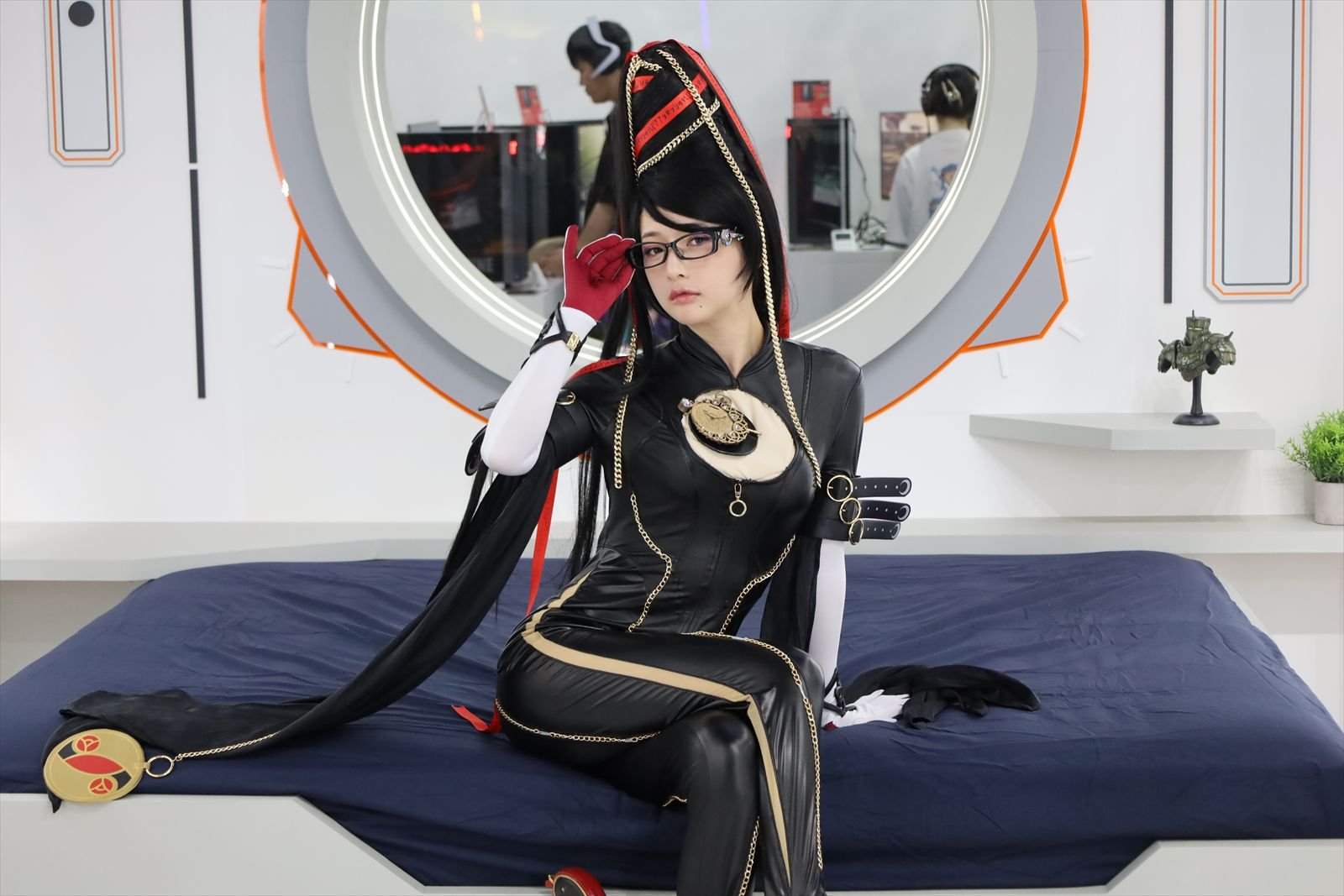 隣接スペースにはラウンジの部屋も再現され、人類の拠点「アルビオン」からの夕景を眺められる窓が設置されていた。さらに中央のベッドには、『ベヨネッタ』の衣装を纏ったコスプレイヤー・月野ももさんが登場。世界観に完全に溶け込んだ姿は、まさに両作のコラボの必然性を感じさせるものだった。
