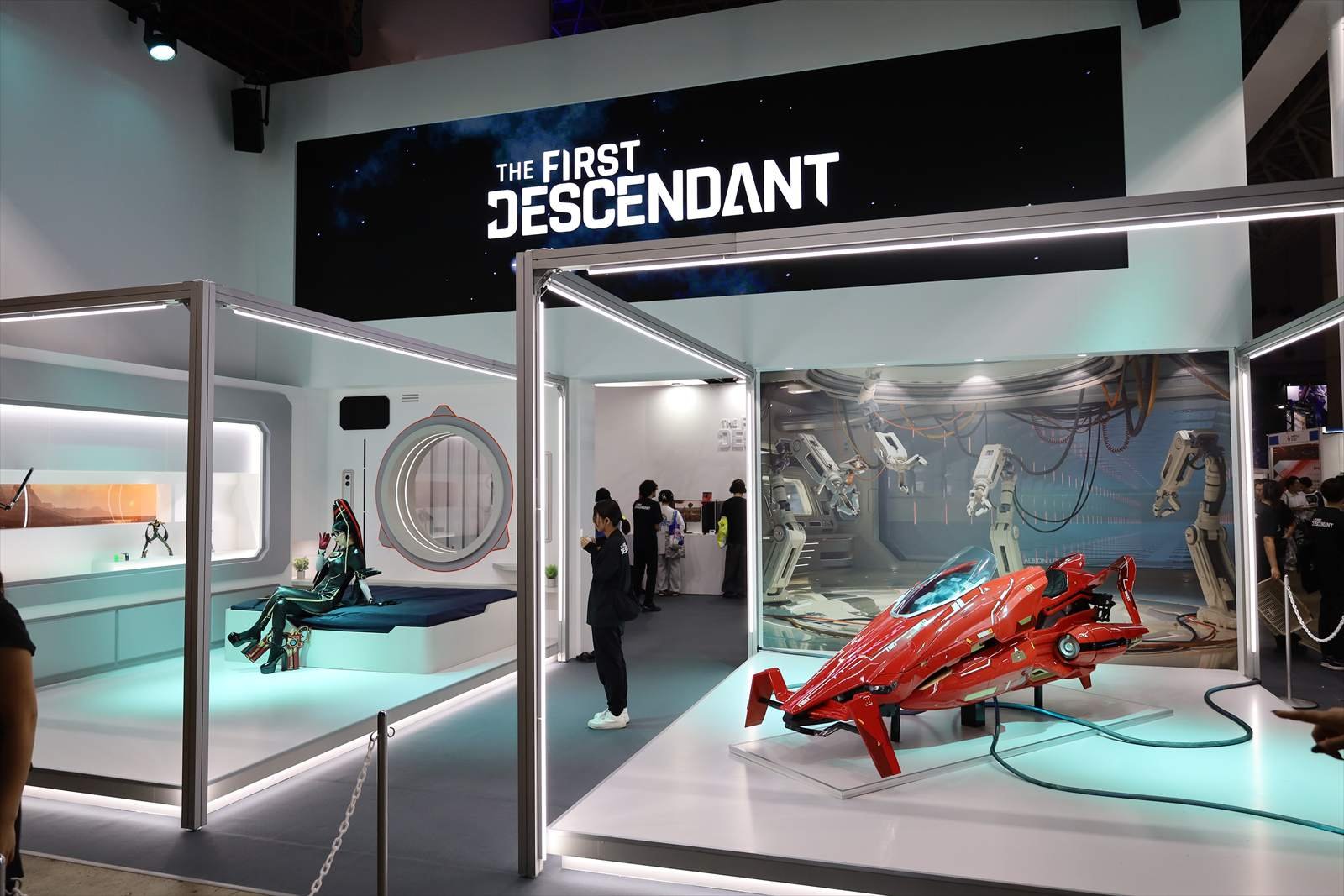 ここからは、東京ゲームショウ2025の『The First Descendant』ブースの様子をお届けする。まず目を引いたのは、シーズン3の新要素「ラウンジ」を再現した白基調の空間だ。清潔感と未来感を併せ持つデザインは、まるでゲーム内の一室をそのまま持ってきたかのよう。『The First Descendant』を知らない来場者も足を止め、フォトスポットとしても人気を集めていた。