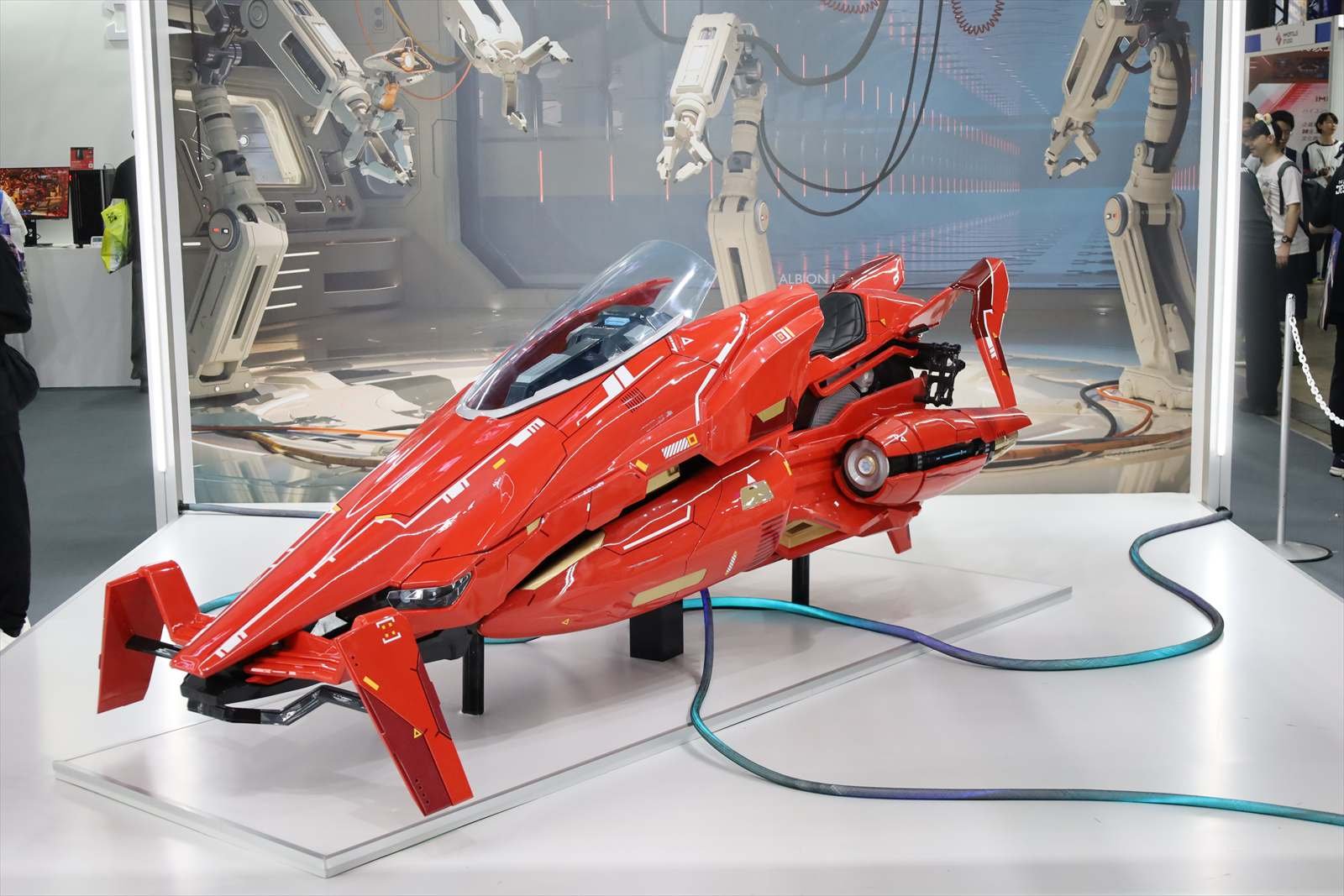そして最大の目玉は、実物大のホバーバイク「ボルテックス」の展示である。流線形のボディに赤い塗装が映え、光沢のある質感がまるで実機のようなリアリティを放つ。全長は大型バイクほどで、画面の中では軽やかに見える乗り物が、実物では迫力と重量感を伴って迫ってくる。ゲーム内で改めてホバーバイクに乗るときの体感も変わりそうだ。シーズンのテーマ「突破」を表したような疾走感を感じる力の入った展示物となっている。