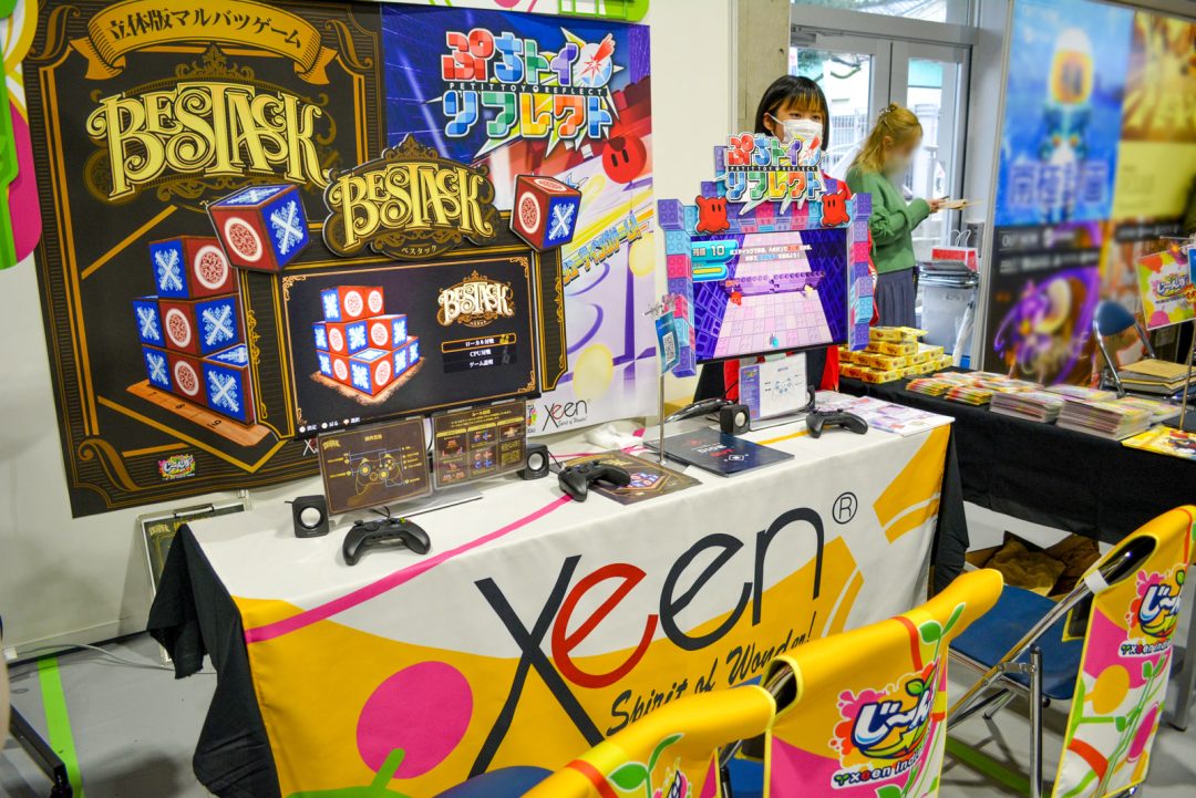 今回のTIGSで「じ~んず」は、『TIGS プログラミングバトル スーパータンクウォーズ』『BESTACK(べスタック)』『ぷちトイ◒リフレクト』そしてアナログゲーム『ダイスアウト』の4タイトルを出展した。そのうち3タイトルを実際に試遊してみたところ、実績豊かなxeenらしい、「繰り返し楽しめるプリミティブなゲーム」とのコンセプトに恥じない確かなクオリティのゲーム体験を楽しむことができた。