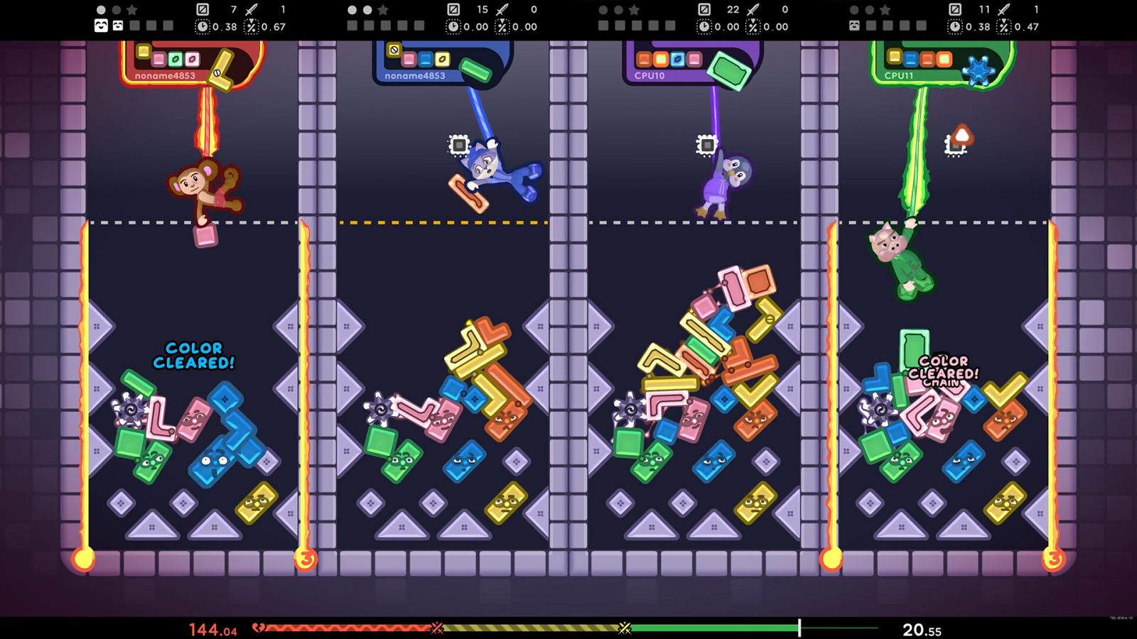 本作は、同じ色のブロックを4つ繋げて消していく、1から4人で遊べる対戦型の落ち物パズルだ。