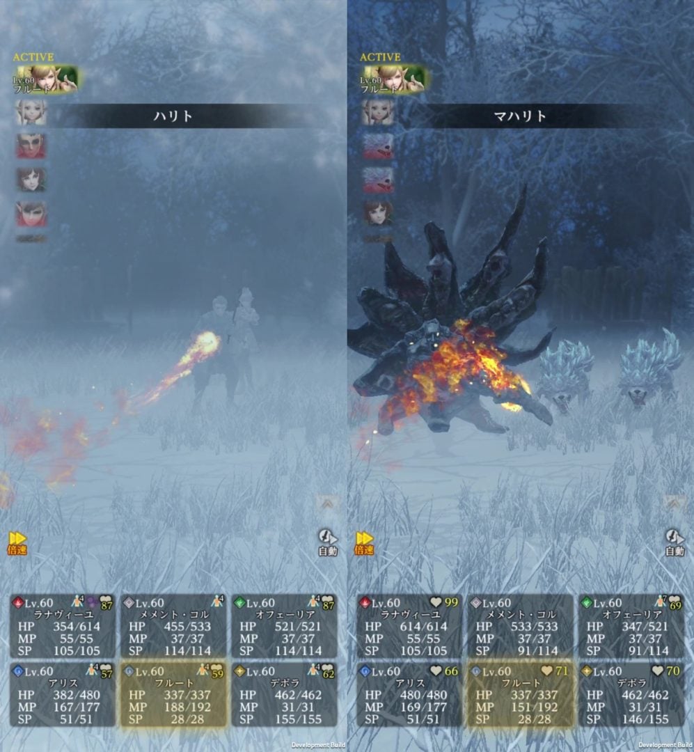 豪雪地帯では「ハリト」系の火属性呪文 が有効な敵も多い(「半凍結」「凍結」は解除されてしまうが)。