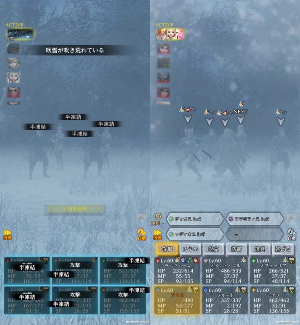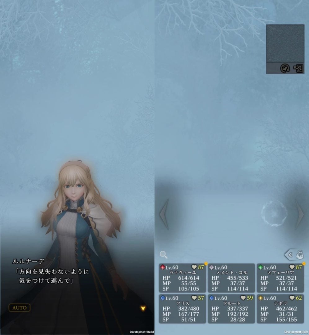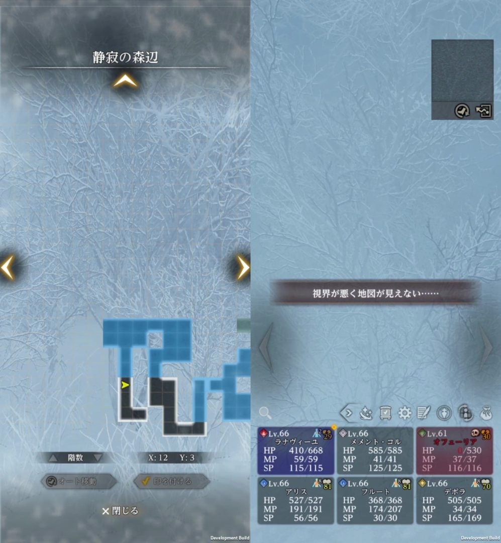 また「吹雪」エリアの中で地図を見られないということは、吹雪の中からはオート移動もできないということでもある。吹雪エリア内での敵との戦闘で消耗してしまった場合、オート移動による帰還に頼れず、遭難してしまう可能性も出てくる。