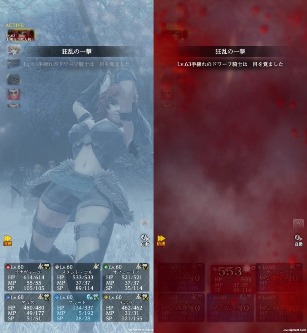 今までの奈落の「交易水路」では「水」を使ったギミック、そして「城塞」では視界でこちらを検知して追いかけてくる「番兵」、そして複雑な上下階層構造が行く手を阻んできたが、「豪雪地帯」はこれらとは違った難易度の路線を追求している印象だ。城塞の番兵は基本的に単体の強敵であったが、豪雪地帯で出現する敵は高い攻撃力と数の暴力、そして「吹雪」という環境で基本的に回避を望めない。縮こまりたくなる寒さとは裏腹に、こちらから積極的に攻撃をかけて敵の数を減らす、もしくは状態異常で無力化するといったアグレッシブな戦術が要求される。