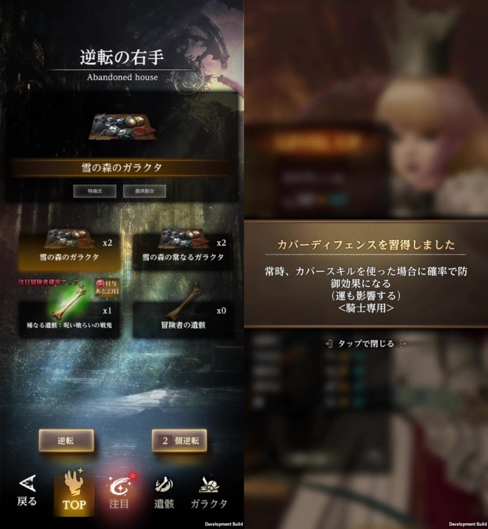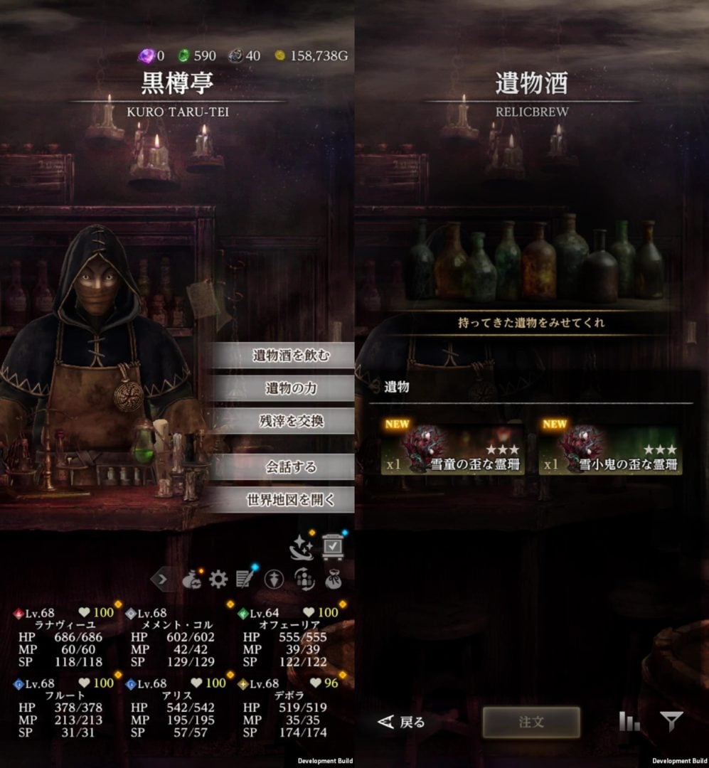 また、今年8月からは「黒樽亭」という施設により「遺物酒」を飲むことができるようになった。これはたまに出現するオーラ付きの強敵を撃破すると稀に出現する「モンスターの遺物」を酒にして飲むことができるという施設で、遺物酒を飲んだ冒険者はそのモンスターに対応した能力値のバフ・デバフを永続で得る。上手く使いこなせばキャラクターの性能強化に繋がるコンテンツだ。