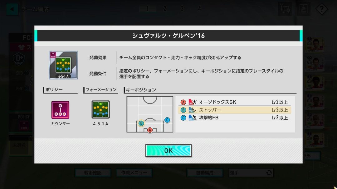 GKのカーワンは成長準備期間でもあるものの、キーポジションのオーソドックスGKのレベル2以上を満たしているのでスタメンで起用する。ほかのキーポジションにふさわしい選手は揃っているし、銀のフォーメーションコンボであるシュヴァルツ・ゲルベン’16を発動しやすいのは大きなアドバンテージだった。