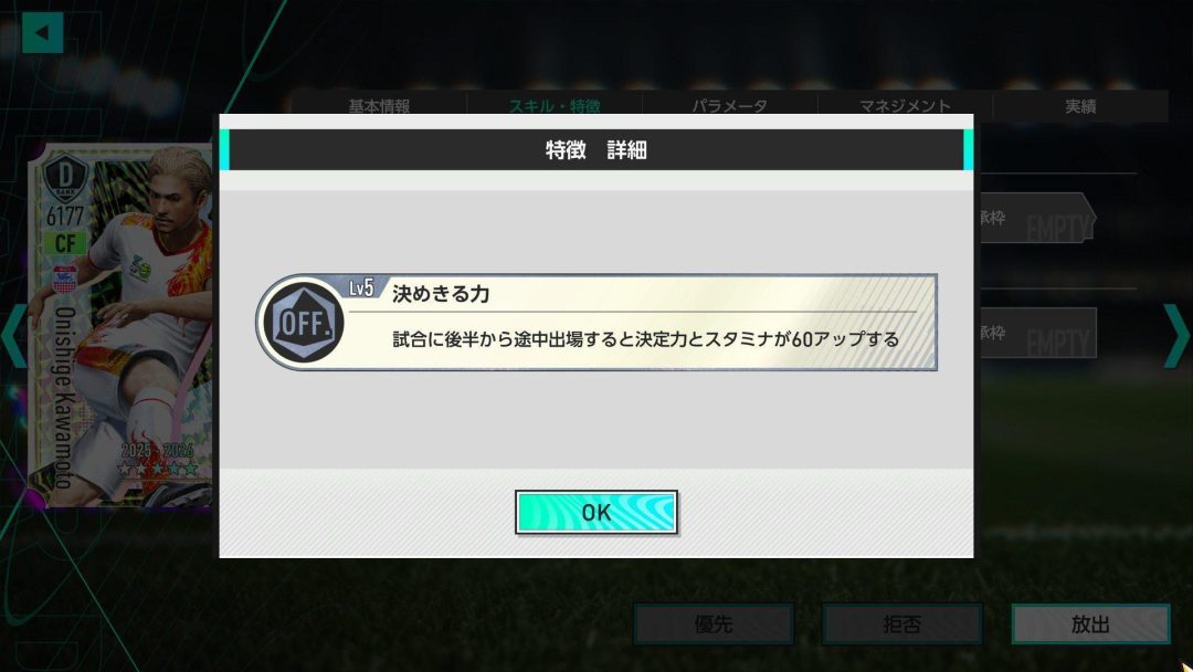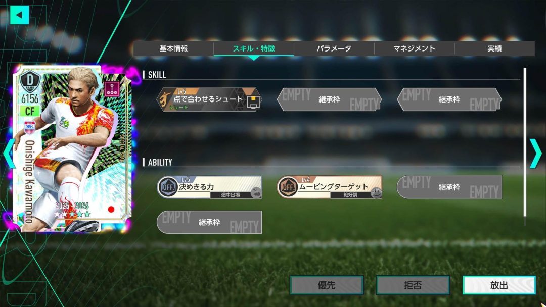 河本鬼茂(以下、鬼茂)は、『サカつく』プレイヤーならお世話になったことのある人も多いだろう。間違いなくシリーズの各作品で日本ナンバーワンのストライカーであり、彼を自クラブに加入させる際の高揚感は特別なものだ。『サカつく』30周年記念キャンペーンにおいて配布された鬼茂を衰えの見えるケインの後継者としたい。鬼茂は「後半から途中出場すると決定力とスタミナが60アップする」というスーパーサブ的な能力をもっているので、基礎的な能力がそろうまでは後半からケインに交代させる形で起用するつもりだ。