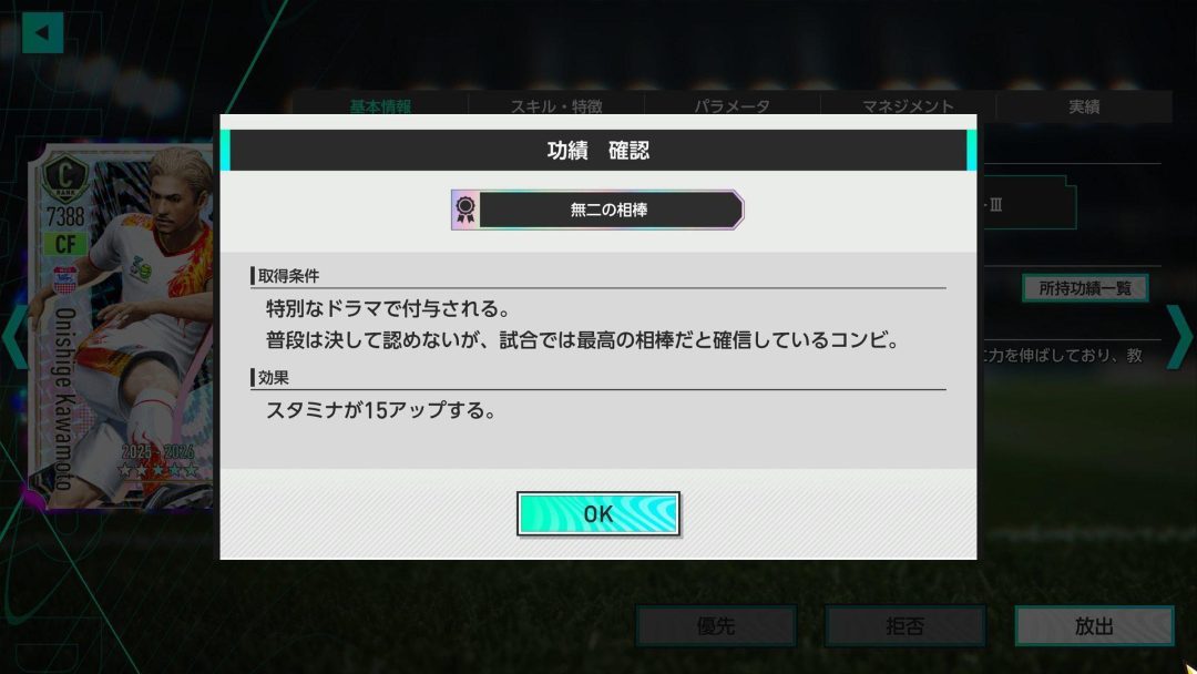 これらのイベントは「最高の相棒」と題されており、かなりの期間にわたって展開される。いくつものミッションを突破してお互いの仲が深まっていく描写が丁寧で、私のFCミュンヘンのセーブデータでは鬼茂とオリーズが相棒と呼び続けられることは間違いないだろう。イベントを最後まで完了することで「無二の親友」という功績を獲得し、イベントに登場した2人のスタミナが15上がった。選手同士がイベントで仲良くなる過程を眺める面白さはもちろん、育成上のメリットも得られる一石二鳥なイベントだった。