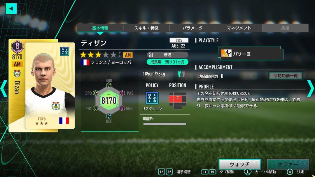 ただし、世界で屈指の選手であっても作中ではベテランになってややピークを過ぎている選手も散見される。CFのハリー・ケインは全盛期は間違いなく世界有数のストライカーではあるが、36歳になって能力の低下は避けられない。CBのダヨ・ウパメカノやAMのジャミー・ムスエラといったような主力も自らの老いとの戦いに瀕しているようだ。ベテランの活躍で勝利を重ねながらも、将来を見据えてのクラブづくりが求められることになるだろう。